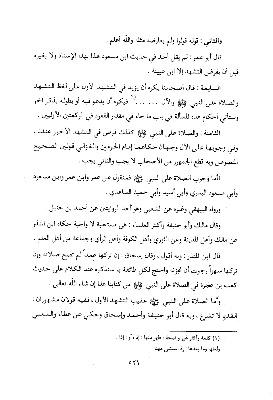 السابعة: قال أصحابنا يكره أن يزيد في التشهد الأول على لفظ التشهد والصلاة على النبي - صلى الله عليه وسلم - والآل ........ (¬1) فيكره أن يدعو فيه أو يطوله بذكر آخر وستأتي أحكام هذه المسألة في باب ما جاء في مقدار القعود في الركعتين الأوليين.