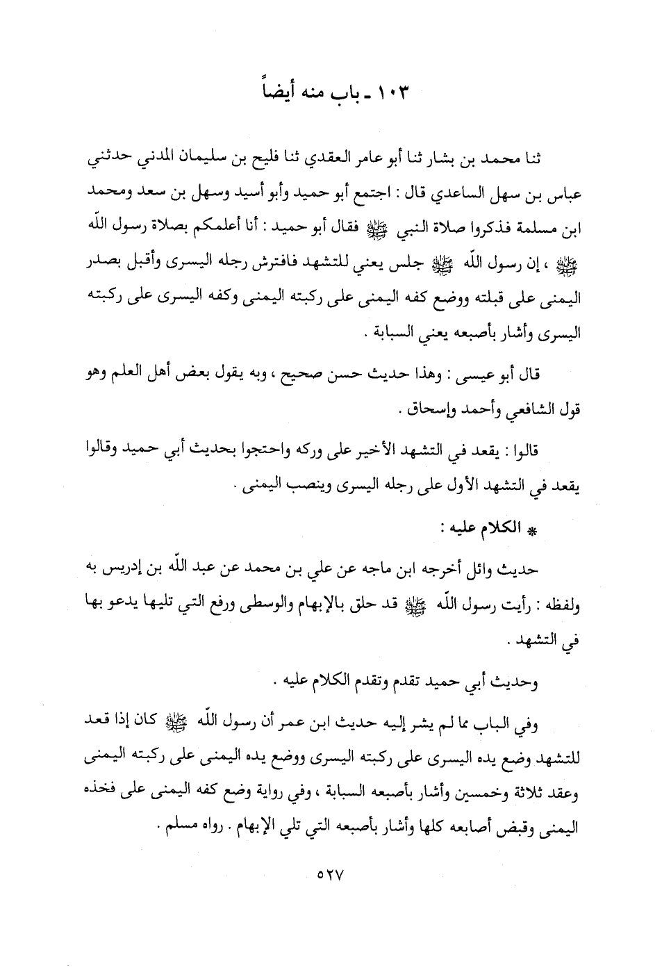 ثنا محمد بن بشار ثنا أبو عامر العقدي ثنا فليح بن سليمان المدني حدثني عباس بن سهل الساعدي قال: اجتمع أبو حميد وأبو أسيد وسهل بن سعد ومحمد بن مسلمة فذكروا صلاة النبي - صلى الله عليه وسلم - فقال أبو حميد: أنا أعلمكم بصلاة رسول الله - صلى الله عليه وسلم -، إن رسول الله - صلى الله عليه وسلم - جلس يعني للتشهد فافترش رجله اليسرى وأقبل بصدر اليمنى على قبلته ووضع كفه اليمنى على ركبته اليمنى وكفه اليسرى على ركبته اليسرى وأشار بأصبعه يعني السبابة.