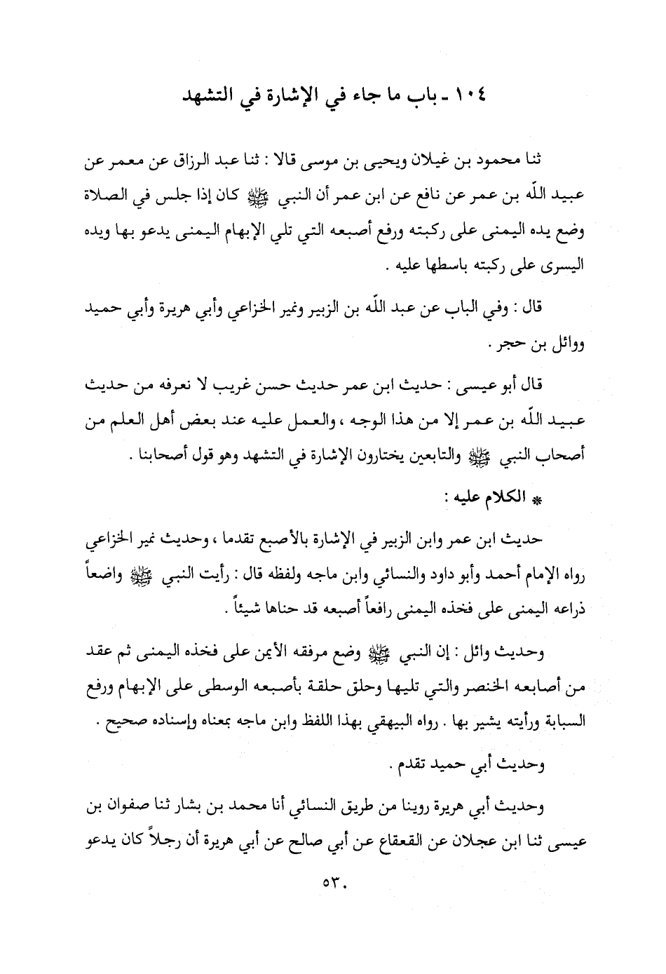 قال أبو عيسى: حديث ابن عمر حديث حسن غريب لا نعرفه من حديث عبيد الله بن عمر إلا من هذا الوجه، والعمل عليه عند بعض أهل العلم من أصحاب النبي - صلى الله عليه وسلم - والتابعين يختارون الإشارة في التشهد وهو قول أصحابنا.