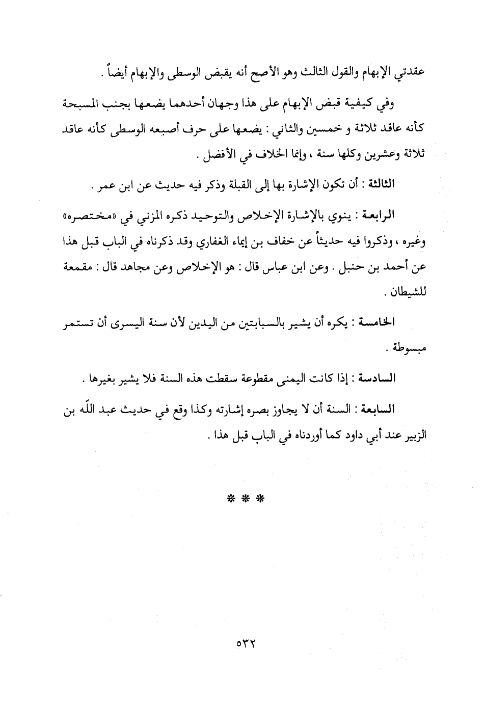 الخامسة: يكره أن يشير بالسبابتين من اليدين لأن سنة اليسرى أن تستمر مبسوطة.