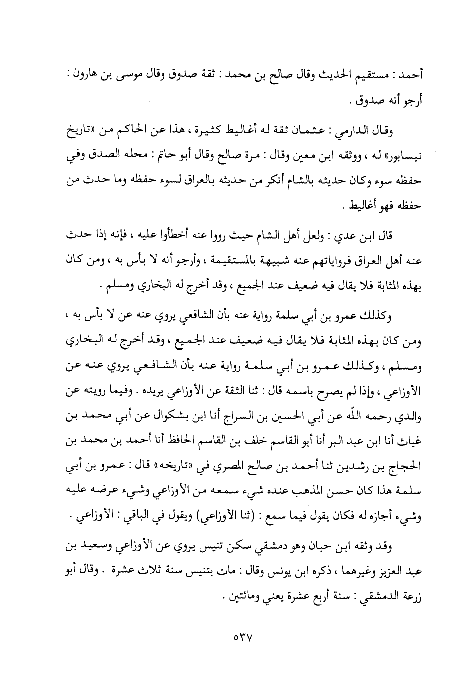 وكذلك عمرو بن أبي سلمة رواية عنه بأن الشافعي يروي عنه عن لا بأس به، ومن كان بهذه المثابة فلا يقال فيه ضعيف عند الجميع، وقد أخرج له البخاري ومسلم، وكذلك عمرو بن أبي سلمة رواية عنه بأن الشافعي يروي عنه عن الأوزاعي، وإذا لم يصرح باسمه قال: ثنا الثقة عن الأوزاعي يريده. وفيما رويته عن والدي رحمه الله عن أبي الحسين بن السراج أنا ابن بشكوال عن أبي محمد بن غياث أنا ابن عبد البر أنا أبو القاسم خلف بن القاسم الحافظ أنا أحمد بن محمد بن الحجاج بن رشدين ثنا أحمد بن صالح المصري في "تاريخه" قال: عمرو بن أبي سلمة هذا كان حسن المذهب عنده شيء سمعه من الأوزاعي وشيء عرضه عليه وشيء أجازه له فكان يقول فيما سمع: (ثنا الأوزاعي) ويقول في الباقي: الأوزاعي.