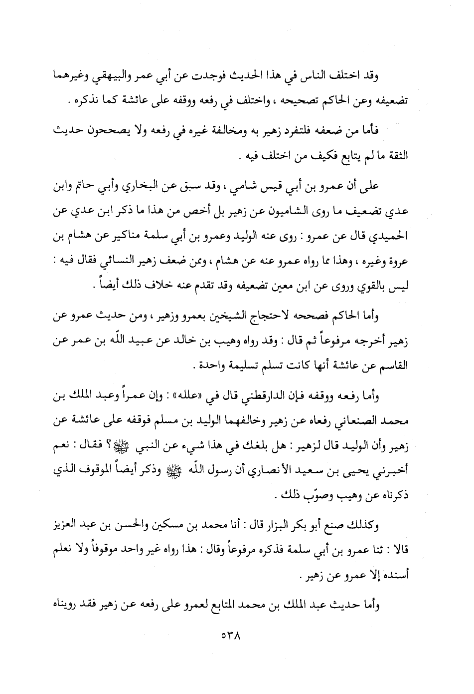 وأما رفعه ووقفه فإن الدارقطني قال في "علله": وإن عمرًا وعبد الملك بن محمد الصنعاني رفعاه عن زهير وخالفهما الوليد بن مسلم فوقفه على عائشة عن زهير وأن الوليد قال لزهير: هل بلغك في هذا شيء عن النبي - صلى الله عليه وسلم -؟ فقال: نعم أخبرني يحيى بن سعيد الأنصاري أن رسول الله - صلى الله عليه وسلم - وذكر أيضًا الموقوف الذي ذكرناه عن وهيب وصوّب ذلك.