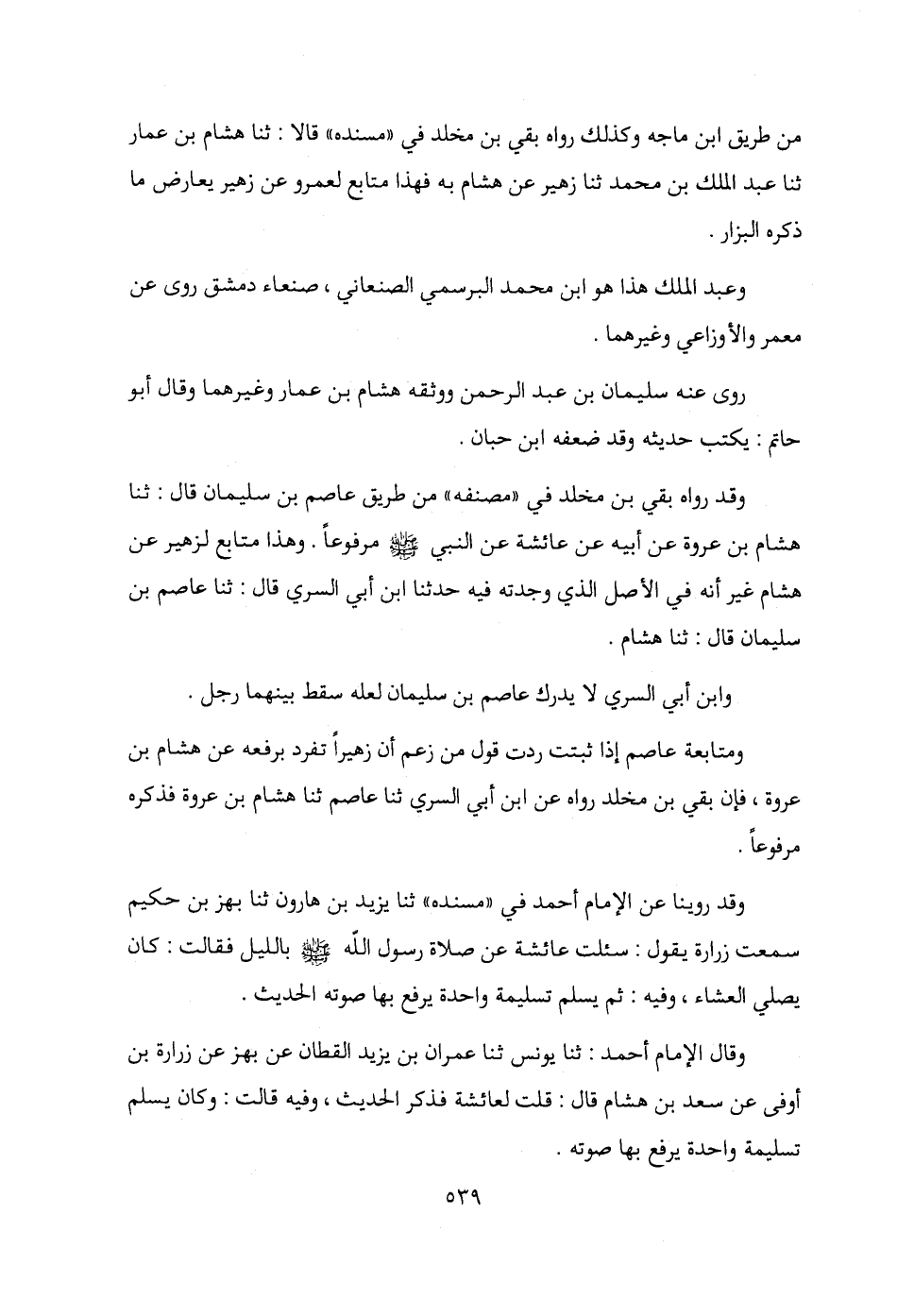 وقد رواه بقي بن مخلد في "مصنفه" من طريق عاصم بن سليمان قال: ثنا هشام بن عروة عن أبيه عن عائشة عن النبي - صلى الله عليه وسلم - مرفوعًا. وهذا متابع لزهير عن هشام غير أنه في الأصل الذي وجدته فيه حدثنا ابن أبي السري قال: ثنا عاصم بن سليمان قال: ثنا هشام.