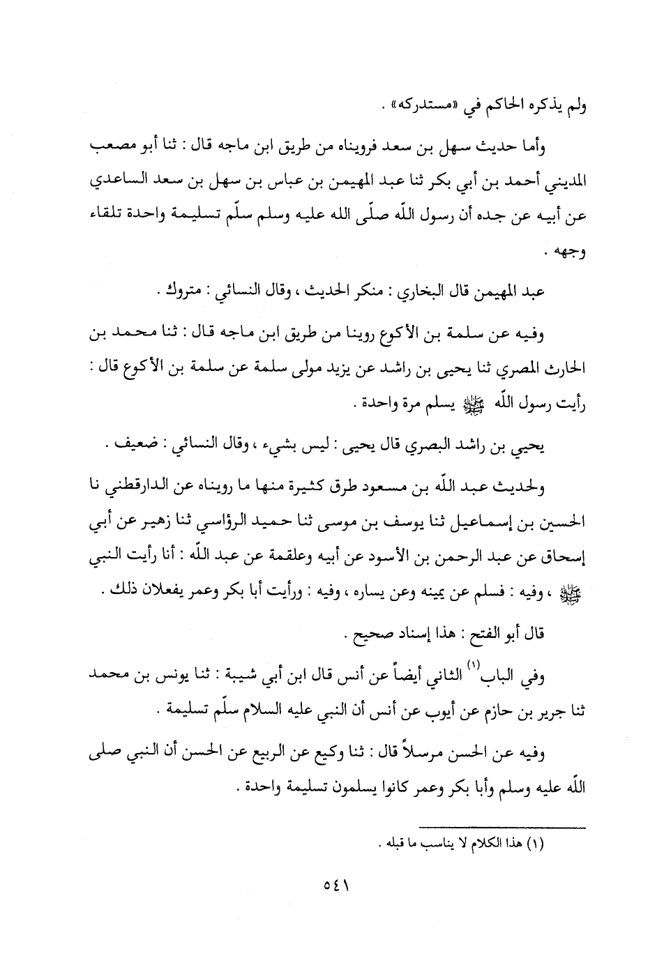 وأما حديث سهل بن سعد فرويناه من طريق ابن ماجه قال: ثنا أبو مصعب المديني أحمد بن أبي بكر ثنا عبد المهيمن بن عباس بن سهل بن سعد الساعدي عن أبيه عن جده أن رسول الله صلى الله عليه وسلم سلّم تسليمة واحدة تلقاء وجهه.