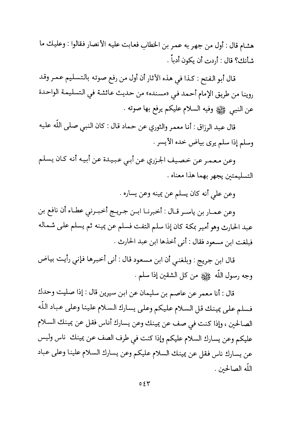 وعن عمار بن ياسر قال: أخبرنا ابن جريج أخبرني عطاء أن نافع بن عبد الحارث وهو أمير بمكة كان إذا سلم التفت فسلم عن يمينه ثم يسلم على شماله فبلغت ابن مسعود فقال: أنى أخذها ابن عبد الحارث.
