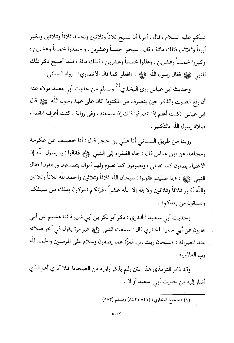 روينا من طريق النسائي أنا علي بن حجر قال: أنا خصيف عن عكرمة ومجاهد عن ابن عباس قال: جاء الفقراء إلى النبي - صلى الله عليه وسلم - فقالوا: يا رسول الله إن الأغنياء يصلون كما نصلي، ويصومون كما نصوم ولهم أموال يتصدقون وينفقون! فقال النبي - صلى الله عليه وسلم -: "إذا صليتم فقولوا: سبحان الله ثلاثًا وثلاثين والحمد لله ثلاثًا وثلاثين والله أكبر ثلاثًا وثلاثين ولا إله إلا الله عشرًا، فإنكم تدركون بذلك من سبقكم وتسبقون من بعدكم".