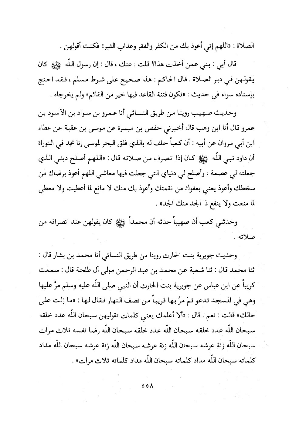 وحديث جويرية بنت الحارث روينا من طريق النسائي أنا محمد بن بشار قال: ثنا محمد قال: ثنا شعبة عن محمد بن عبد الرحمن مولى آل طلحة قال: سمعت كريبًا عن ابن عباس عن جويرية بنت الحارث أن النبي صلى الله عليه وسلم مرَّ عليها وهي في الممسجد تدعو ثمّ مرَّ بها قريبًا من نصف النهار فقال لها: "ما زلت على حالك" قالت: نعم. قال: "ألا أعلمك يعني كلمات تقوليهن سبحان الله عدد خلقه سبحان الله عدد خلقه سبحان الله عدد خلقه سبحان الله رضا نفسه ثلاث مرات سبحان الله زنة عرشه سبحان الله زنة عرشه سبحان الله زنة عرشه سبحان الله مداد كلماته سبحان الله مداد كلماته سبحان الله مداد كلماته ثلاث مرات".