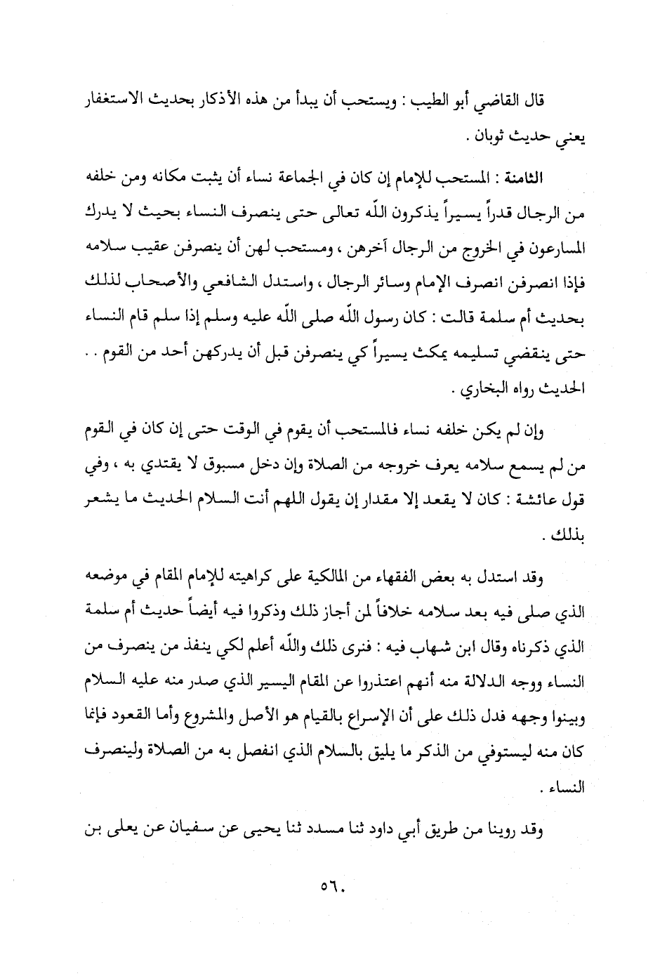 الثامنة: المستحب للإمام إن كان في الجماعة نساء أن يثبت مكانه ومن خلفه من الرجال قدرًا يسيرًا يذكرون الله تعالى حتى ينصرف النساء بحيث لا يدرك المسارعون في الخروج من الرجال آخرهن، ومستحب لهن أن ينصرفن عقيب سلامه فإذا انصرفن انصرف الإمام وسائر الرجال، واستدل الشافعي والأصحاب لذلك بحديث أم سلمة قالت: كان رسول الله صلى الله عليه وسلم إذا سلم قام النساء حتى ينقضي تسليمه يمكث يسيرًا كي ينصرفن قبل أن يدركهن أحد من القوم .. الحديث رواه البخاري.