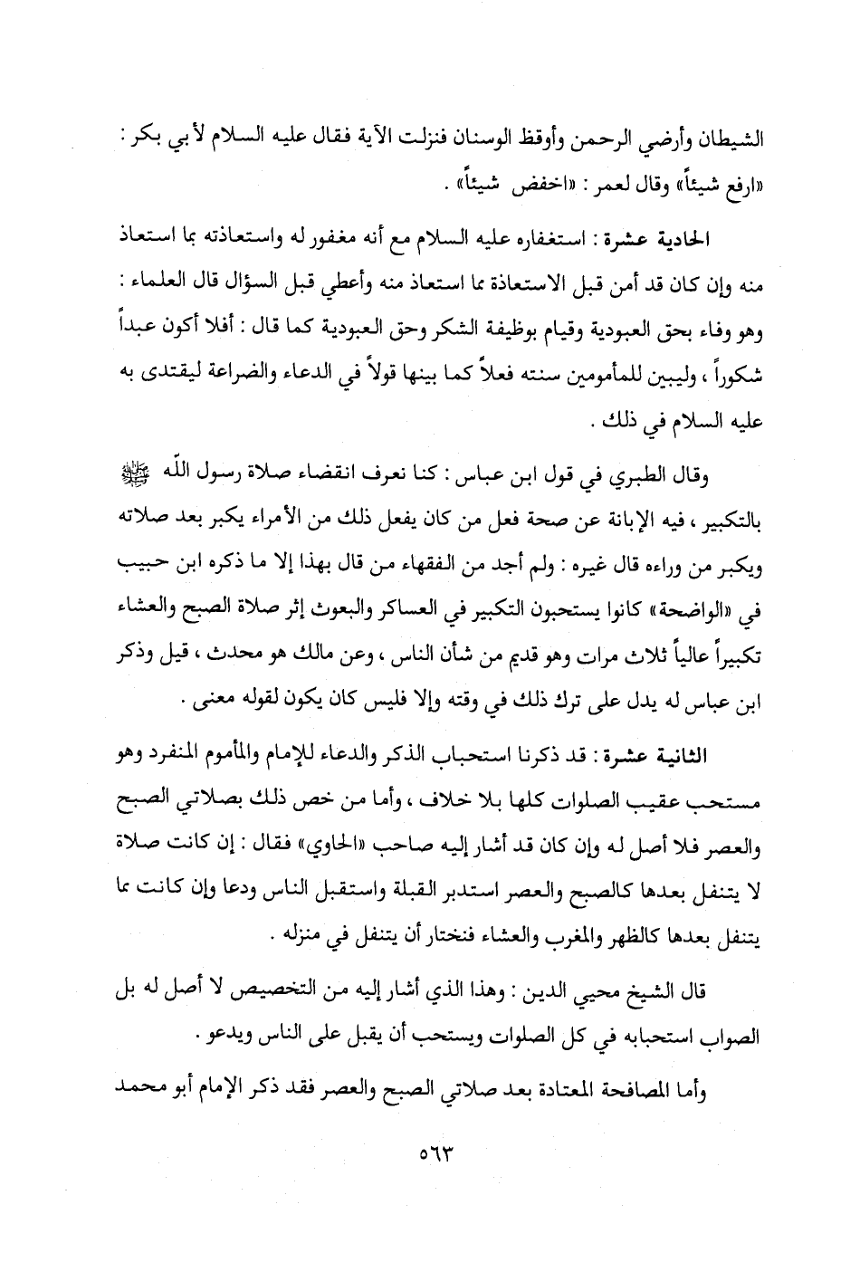 الحادية عشرة: استغفاره - عليه السلام - مع أنه مغفور له واستعاذته بها استعاذ منه وإن كان قد أمن قبل الاستعاذة مما استعاذ منه وأعطي قبل السؤال قال العلماء: وهو وفاء بحق العبودية وقيام بوظيفة الشكر وحق العبودية كما قال: أفلا أكون عبدًا شكورًا، وليبين للمأمومين سنته فعلًا كما بينها قولًا في الدعاء والضراعة ليقتدى به - عليه السلام - في ذلك.