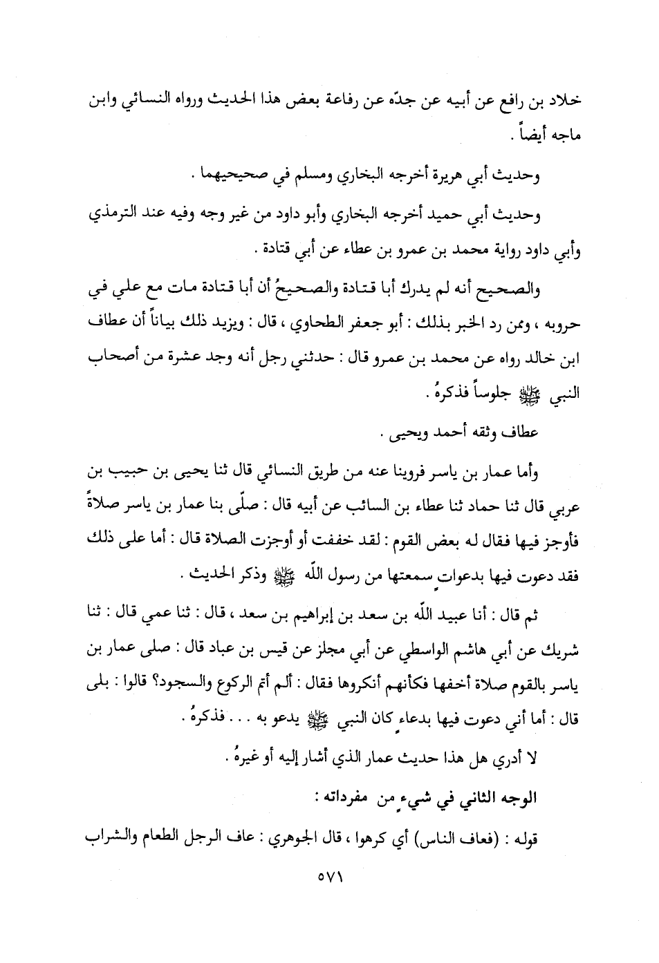 وأما عمار بن ياسر فروينا عنه من طريق النسائي قال ثنا يحيى بن حبيب بن عربي قال ثنا حماد ثنا عطاء بن الساثب عن أبيه قال: صلّى بنا عمار بن ياسر صلاةً فأوجز فيها فقال له بعض القوم: لقد خففت أو أوجزت الصلاة قال: أما على ذلك فقد دعوت فيها بدعواتٍ سمعتها من رسول الله - صلى الله عليه وسلم - وذكر الحديث.
