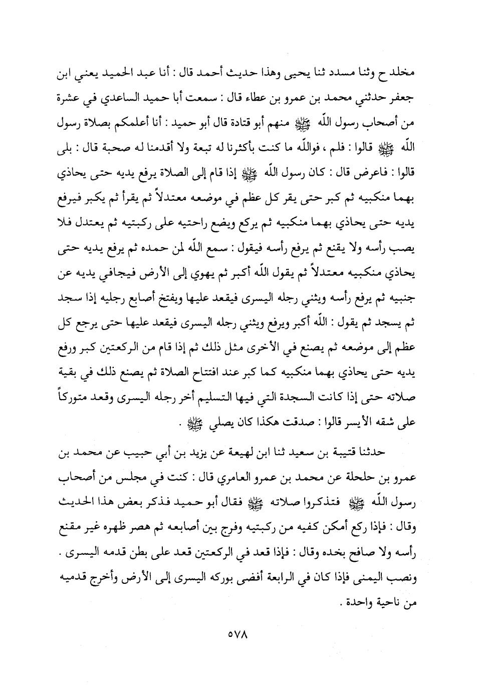 مخلد ح وثنا مسدد ثنا يحيى وهذا حديث أحمد قال: أنا عبد الحميد يعني ابن جعفر حدثني محمد بن عمرو بن عطاء قال: سمعت أبا حميد الساعدي في عشرة من أصحاب رسول الله - صلى الله عليه وسلم - منهم أبو قتادة قال أبو حميد: أنا أعلمكم بصلاة رسول الله - صلى الله عليه وسلم - قالوا: فلم، فوالله ما كنت بأكثرنا له تبعة ولا أقدمنا له صحبة قال: بلى قالوا: فاعرض قال: كان رسول الله - صلى الله عليه وسلم - إذا قام إلى الصلاة يرفع يديه حتى يحاذي بهما منكبيه ثم كبر حتى يقر كل عظم في موضعه معتدلًا ثم يقرأ ثم يكبر فيرفع يديه حتى يحاذي بهما منكبيه ثم يركع ويضع راحتيه على ركبتيه ثم يعتدل فلا يصب رأسه ولا يقنع ثم يرفع رأسه فيقول: سمع الله لمن حمده ثم يرفع يديه حتى يحاذي منكبيه معتدلًا ثم يقول الله أكبر ثم يهوي إلى الأرض فيجافي يديه عن جنبيه ثم يرفع رأسه ويثني رجله اليسرى فيقعد عليها ويفتح أصابع رجليه إذا سجد ثم يسجد ثم يقول: الله أكبر ويرفع ويثني رجله اليسرى فيقعد عليها حتى يرجع كل عظم إلى موضعه ثم يصنع في الأخرى مثل ذلك ثم إذا قام من الركعتين كبر ورفع يديه حتى يحاذي بهما منكبيه كما كبر عند افتتاح الصلاة ثم يصنع ذلك في بقية صلاته حتى إذا كانت السجدة التي فيها التسليم أخر رجله اليسرى وقعد متوركًا على شقه الأيسر قالوا: صدقت هكذا كان يصلي - صلى الله عليه وسلم -.