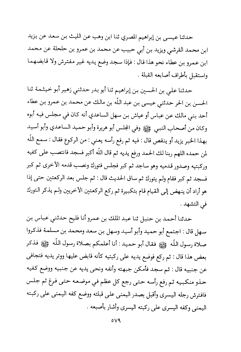حدثنا أحمد بن حنبل ثنا عبد الملك بن عمرو أنا فليح حدثني عباس بن سهل قال: اجتمع أبو حميد وأبو أسيد وسهل بن سعد ومحمد بن مسلمة فذكروا صلاة رسول الله عن فقال أبو حميد: أنا أعلمكم بصلاة رسول الله - صلى الله عليه وسلم - فذكر بعض هذا قال: ثم ركع فوضع يديه على ركبتيه كأنه قابض عليها ووتر يديه فتجافى عن جنبيه قال: ثم سجد فأمكن جبهته وأنفه ونحى يديه عن جنبيه ووضع كفيه حذو منكبيه ثم رفع رأسه حتى رجع كل عظم في موضعه حتى فرغ ثم جلس فافترش رجله اليسرى وأقبل بصدر اليمنى على قبلته ووضع كفه اليمنى على ركبته اليمنى وكفه اليسرى على ركبته اليسرى وأشار بأصبعه.