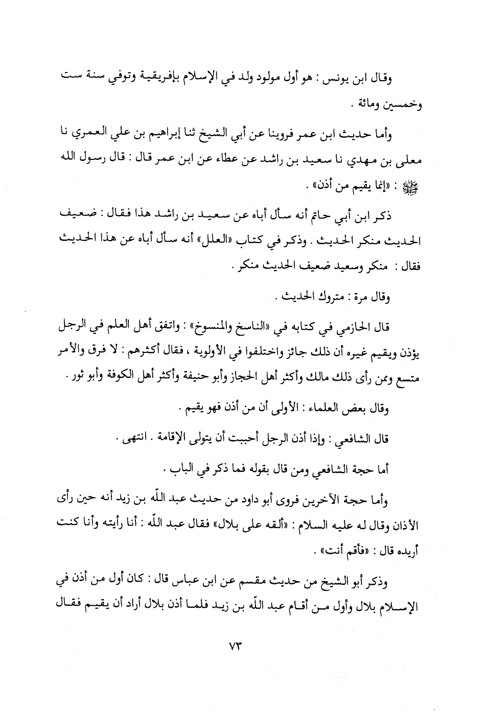 وأما حديث ابن عمر فروينا عن أبي الشيخ ثنا إبراهيم بن علي العمري نا معلي بن مهدي نا سعيد بن راشد عن عطاء عن ابن عمر قال: قال رسول الله - صلى الله عليه وسلم -: "إنما يقيم من أذن".