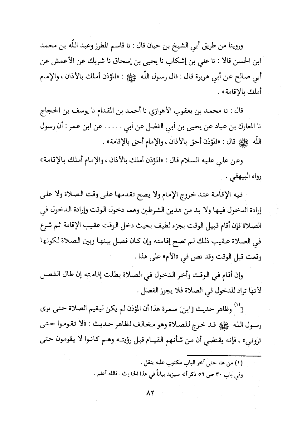 وروينا من طريق أبي الشيخ بن حيان قال: نا قاسم المطرز وعبد الله بن محمد بن الحسن قالا: نا علي بن إشكاب نا يحيى بن إسحاق نا شريك عن الأعمش عن أبي صالح عن أبي هريرة قال: قال رسول الله - صلى الله عليه وسلم -: "المؤذن أملك بالأذان، والإمام أملك بالإقامة".