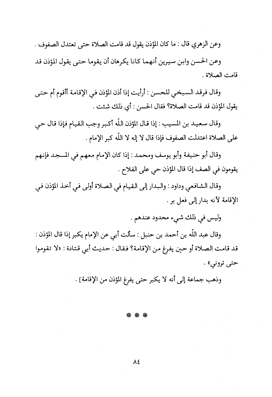 وقال عبد الله بن أحمد بن حنبل: سألت أبي عن الإمام يكبر إذا قال المؤذن: قد قامت الصلاة أو حين يفرغ من الإقامة؟ فقال: حديث أبي قتادة: "لا تقوموا حتى تروني".