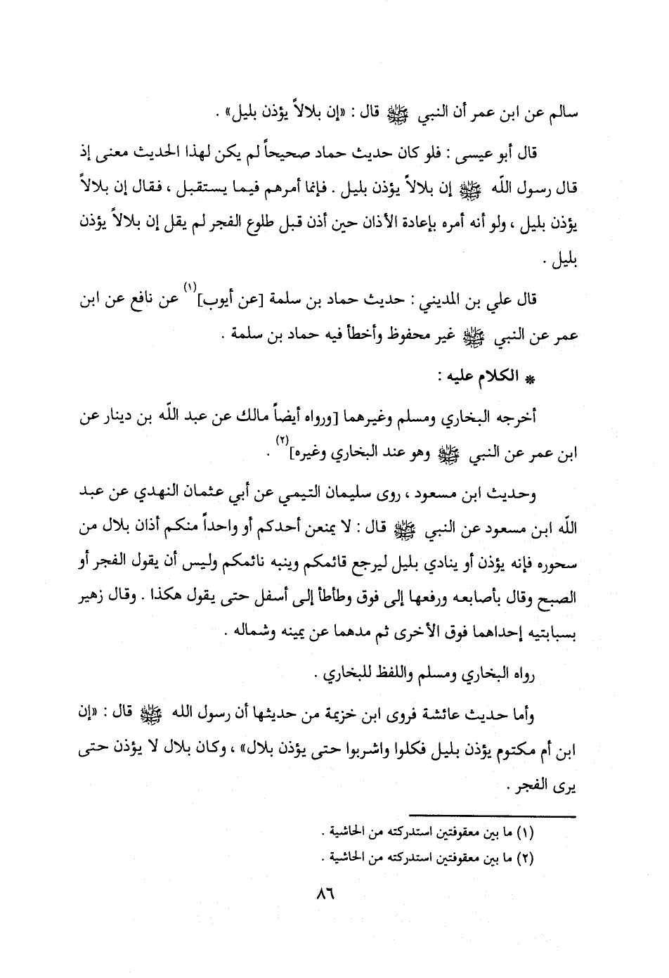 سالم عن ابن عمر أن النبي - صلى الله عليه وسلم - قال: "إن بلالًا يؤذن بليل".