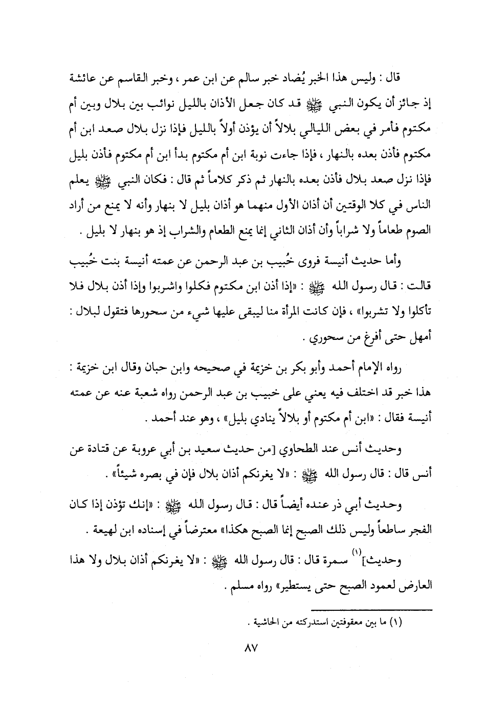 رواه الإمام أحمد وأبو بكر بن خزيمة في صحيحه وابن حبان وقال ابن خزيمة: هذا خبر قد اختلف فيه يعني على حُبيب بن عبد الرحمن رواه شعبة عنه عن عمته أنيسة فقال: "ابن أم مكتوم أو بلالًا ينادي بليل"، وهو عند أحمد.