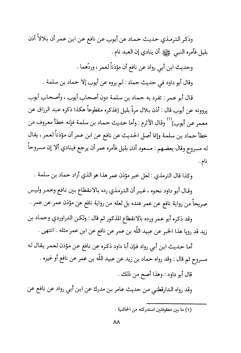 أما حديث ابن أبي رواد فإن أبا داود ذكره عن نافع عن مؤذن لعمر يقال له مسروح ثم قال: وقد رواه حماد بن زيد عن عبيد الله بن عمر عن نافع أو غيره.