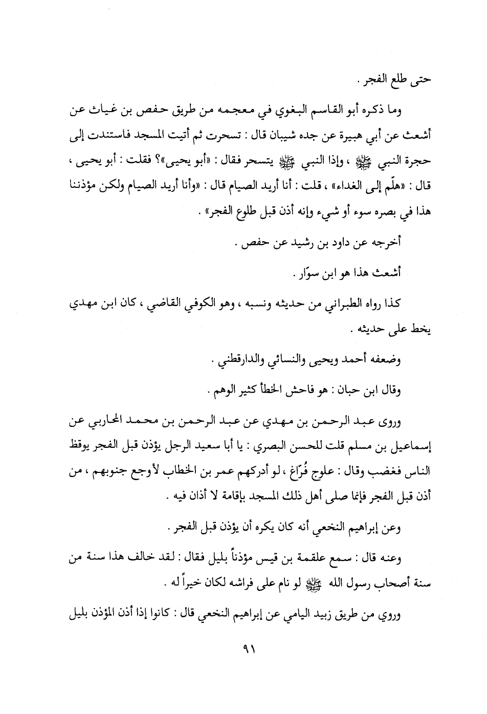 وما ذكره أبو القاسم البغوي في معجمه من طريق حفص بن غياث عن أشعث عن أبي هبيرة عن جده شيبان قال: تسحرت ثم أتيت المسجد فاستندت إلى حجرة النبي - صلى الله عليه وسلم -، وإذا النبي - صلى الله عليه وسلم - يتسحر فقال: "أبو يحيى"؟ فقلت: أبو يحيى، قال: "هلم إلى الغداء"، قلت: أنا أريد الصيام قال: "وأنا أريد الصيام ولكن مؤذننا هذا في بصره سوء أو شيء وإنه أذن قبل طلوع الفجر".