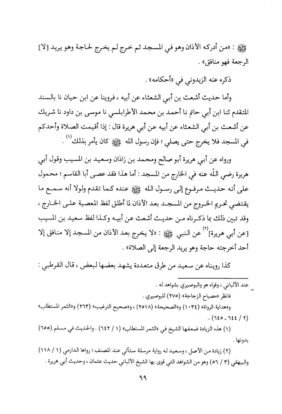- صلى الله عليه وسلم -: "من أدركه الأذان وهو في المسجد ثم خرج لم يخرج لحاجة وهو يريد [لا] الرجعة فهو منافق".