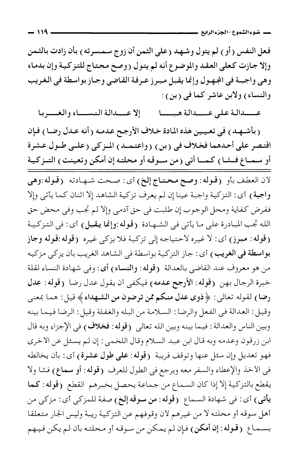 فعل النفس (أو) لم يتول وشهد (على الثمن أن زوج سمسرته) بأن زادت بالثمن وإلا جازت كعلى العقد والموضع أنه لم يتول (وصح محتاج للتزكية وإن بدماء وهي واجبة في المجهول وإنما يقبل مبرز عرفة القاضي وجاز بواسطة في الغريب والنساء) ولابن عاشر كما في (بن):
