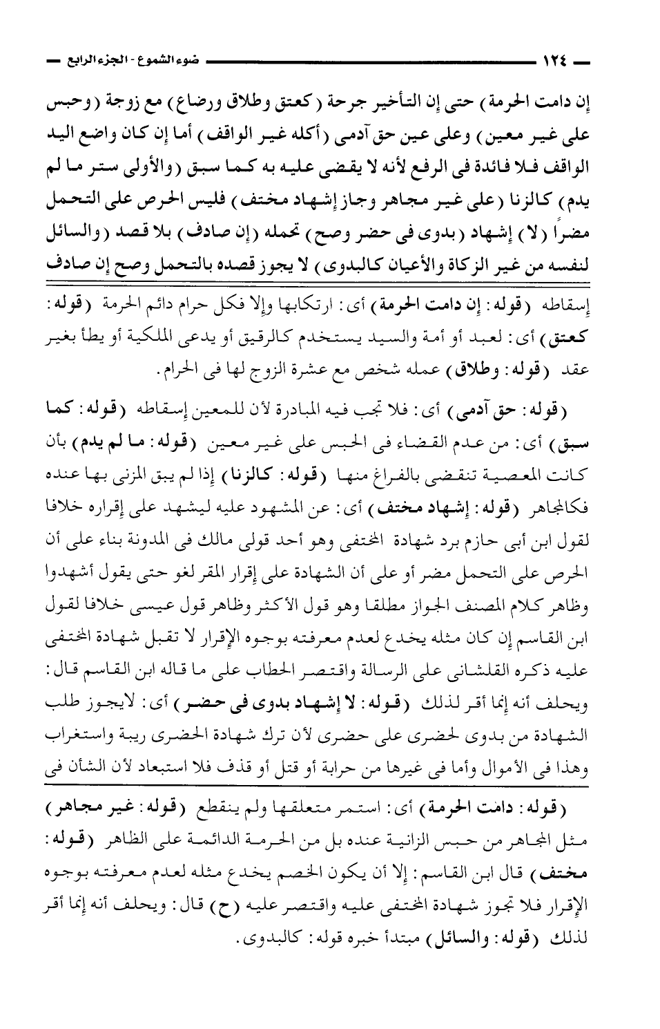 (قوله: دامت الحرمة) أي: استمر متعلقها ولم ينقطع (قوله: غير مجاهر) مثل المجاهر من حبس الزانية عنده بل من الحرمة الدائمة على الظاهر (قوله: مختف) قال ابن القاسم: إلا أن يكون الخصم يخدع مثله لعدم معرفته بوجوه الإقرار فلا تجوز شهادة المختفي عليه واقتصر عليه (ح) قال: ويحلف أنه إنما أقر لذلك (قوله: والسائل) مبتدأ خبره قوله: كالبدوي.