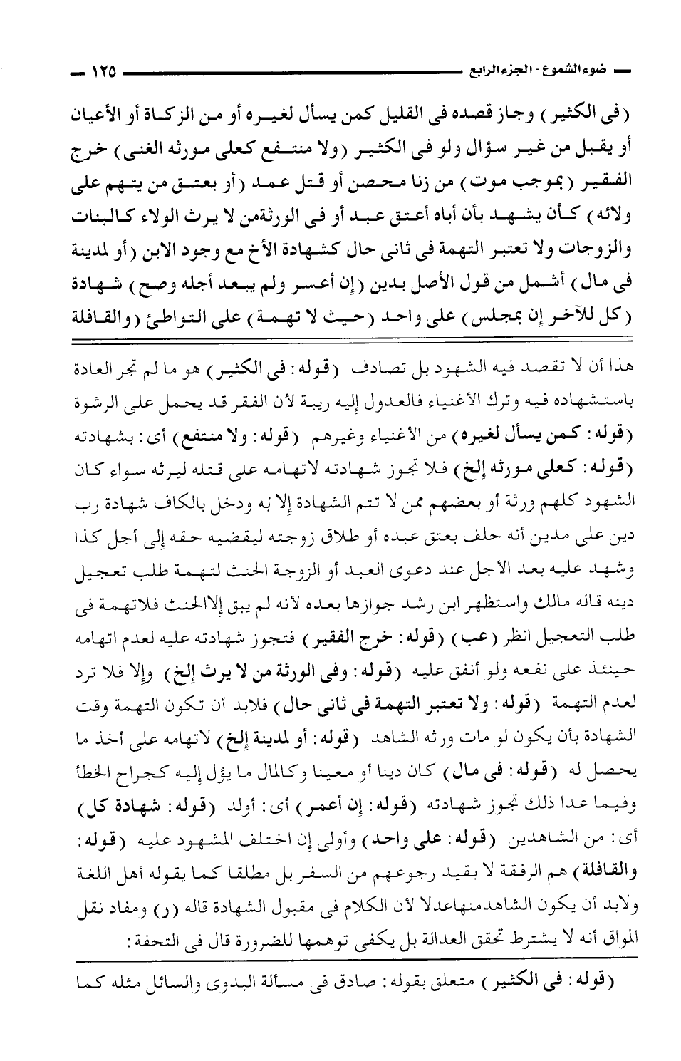 (في الكثير) وجاز قصده في القليل كمن يسأل لغيره أو من الزكاة أو الأعيان أو يقبل من غير سؤال ولو في الكثير (ولا منتفع كعلى مورثه الغنى) خرج الفقير (بموجب موت) من زنا محصن أو قتل عمد (أو بعتق من يتهم على ولائه) كأن يشهد بأن أباه أعتق عبد أو في الورثة من لا يرث الولاء كالبنات والزوجات ولا تعتبر التهمة في ثاني حال كشهادة الأخ مع وجود الابن (أو لمدينة في مال) أشمل من قول الأصل بدين (إن أعسر ولم يبعد أجله وصح) شهادة (كل للآخر إن بمجلس) على واحد (حيث لا تهمة) على التواطؤ (والقافلة