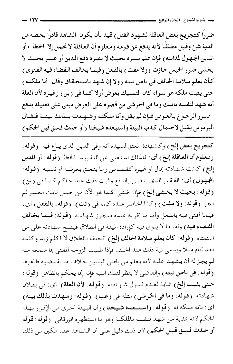 دفع ضررا كتجريح بعض العاقلة لشهود القتل) قيد بأن يكون الشاهد قادرا يخصه من الدية شيء وقيل مطلقا لأنه يدفع عن قومه ومعلوم أن العاقلة لا تحمل إلا الخطأ أو المدين المجهول لمداينه) فإن علم يسره بحيث لا يضره دفع الدين أو عسر بحيث لا يخشى ضرر الحبس جازت (ولا مفت) بالفعل (فيما يخالف القضاء فيه الفتوى) كأن يعلم سلامة الحالف في باطن نيته (ولا إن شهد باستحقاق وقال: أنا ملكته) حتى يثبت ملكه هو سواء كان التمليك بعوض أو لا كما في (بن) وغيره لأن العلة أنه شهد لنفسه بالملك وما في الخرشي من قصره على العرض مبني على تعليله بدفع ضرر الرجوع بالعوض فإن لم يقل وأنا ملكته وشهدت بذلك بينة فقال البرموني يقبل لاحتمال كذب البينة واستبعده شيخنا (أو حدث فسق قبل الحكم)