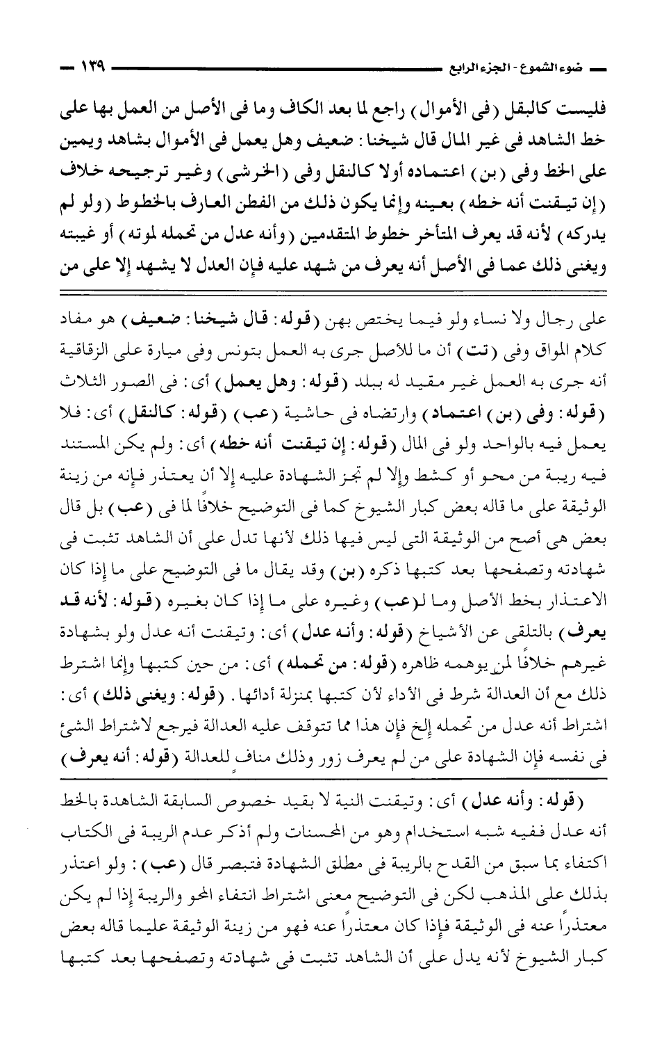 على رجال ولا نساء ولو فيما يختص بهن (قوله: قال شيخنا: ضعيف) هو مفاد كلام المواق وفي (تت) أن ما للأصل جرى به العمل بتونس وفي ميارة على الزقاقية أنه جرى به العمل غير مقيد له ببلد (قوله: وهل يعمل) أي: في الصور الثلاث (قوله: وفي (بن) اعتماد) وارتضاه في حاشية (عب) (قوله: كالنقل) أي: فلا يعمل فيه بالواحد ولو في المال (قوله: إن تيقنت أنه خطه) أي: ولم يكن المستند فيه ريبة من محو أو كشط وإلا لم تجز الشهادة عليه إلا أن يتعذر فإنه من زينة الوثيقة على ما قاله بعض كبار الشيوخ كما في التوضيح خلافا لما في (عب) بل قاله بعض هي أصح من الوثيقة التي ليس فيها ذلك لأنها تدل على أن الشاهد تثبت في شهادته وتصفحها بعد كتبها ذكره (بن) وقد يقال ما في التوضيح على ما إذا كان الاعتذار بخط الأصل وما ل (عب) وغيره على ما إذا كان بغيره (قوله: لأنه قد يعرف) بالتلقي عن الأشياخ (قوله: وأنه عدل) أي: وتيقنت أنه عدل ولو بشهادة غيرهم خلافا لمن يوهمه ظاهره (قوله: من تحمله) أي: من حين كتبها وإنما اشترط ذلك مع أن العدالة شرط في الأداء لأن كتبها بمنزلة أدائها. (قوله: ويغني ذلك) أي: اشتراط أنه عدل من تحمله إلخ فإن هذا مما تتوقف عليه العدالة فيرجع لاشتراط الشيء في نفسه فإن الشهادة على من لم يعرف زور وذلك مناف للعدالة (قوله: أنه يعرف)