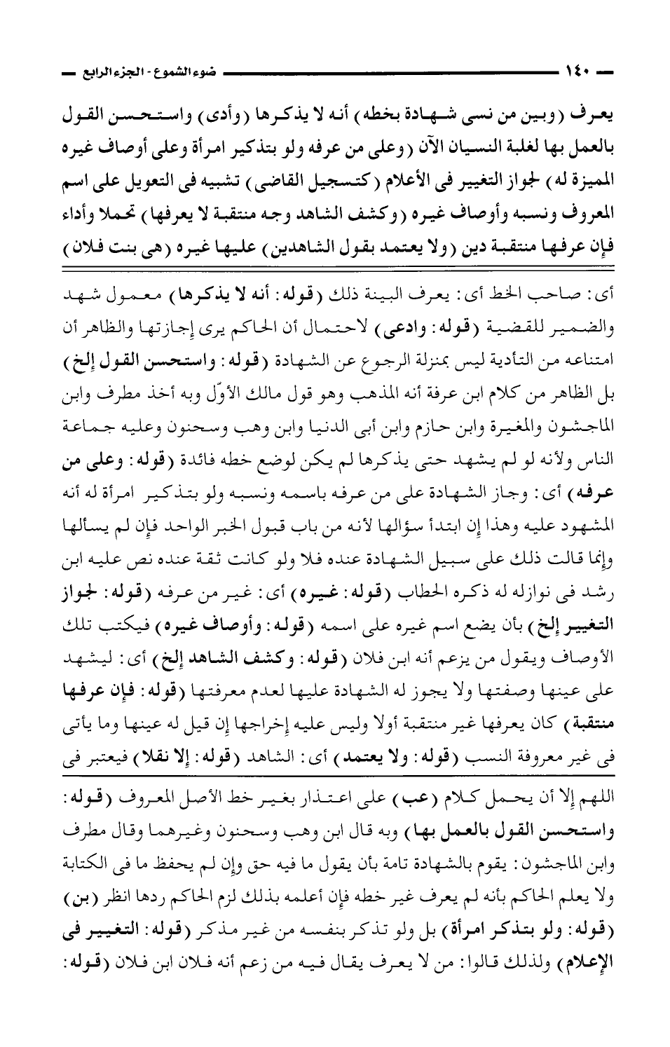 يعرف (وبين من نسى شهادة بخطه) أنه لا يذكر (وأدى) واستحسن القول بالعمل بها لغلبة النسيان الآن (وعلى من عرفه ولو بتذكير امرأة وعلى أوصاف غيره المميزة له) لجواز التغيير في الأعلام (كتسجيل القاضي) تشبيه في التعويل على اسم المعروف ونسبه وأوصاف غيره (وكشف الشاهد وجه منتقبة لا يعرفها) تحملا وأداء فإن عرفها منتقبة دين (ولا يعتمد بقول الشاهدين) عليها غيره (هي بنت فلان