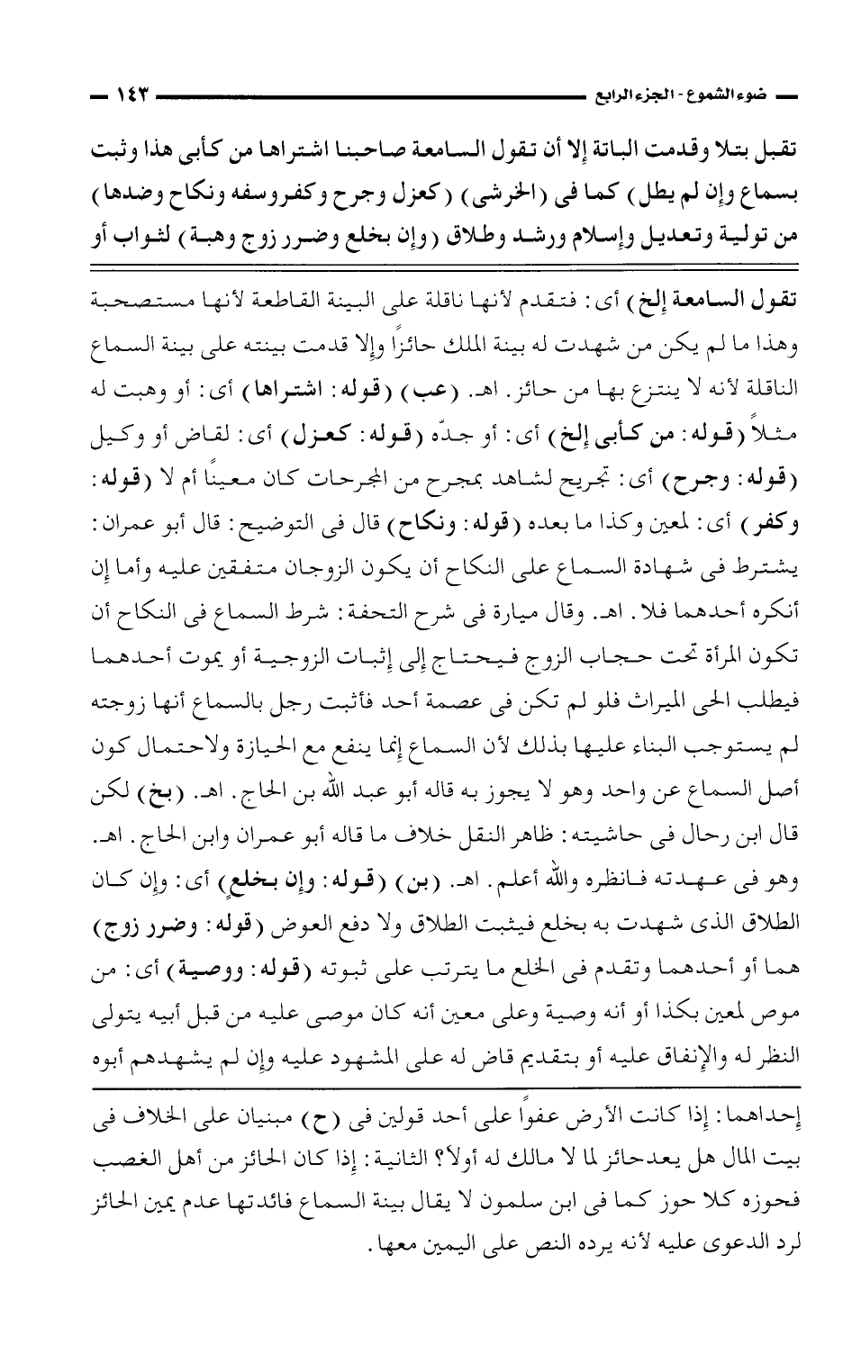 تقبل بتلا وقدمت الباتة إلا أن تقول السامعة صاحبنا اشتراها من كأبي هذا وثبت بسماع وإن لم يطل) كما في (الخرشي) (كغزل وجرح وكفر وسفه ونكاح وضدها) من تولية وتعديل وإسلام ورشد وطلاق (وإن بخلع وضرر زوج وهبة) لثواب أو