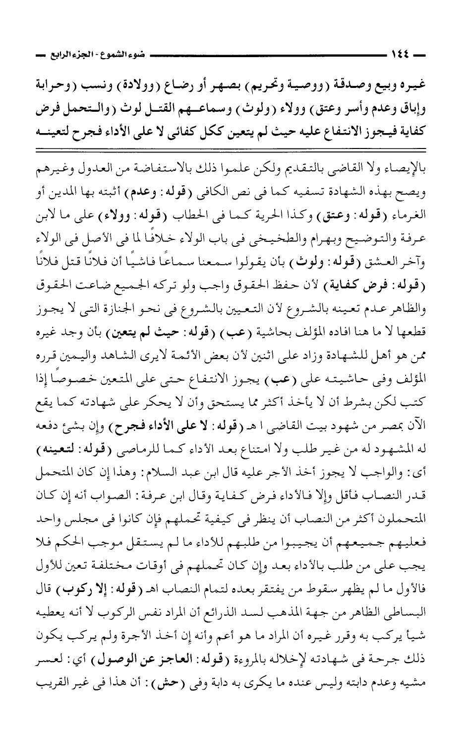 غيره وبيع وصدقة (ووصية وتحريم) بصهر أو رضاع (وولادة) ونسب (وحرابة وإباق وعدم وأسر وعتق) وولاء (ولوث) وسماعهم القتل لوث (والتحمل فرض كفاية فيجوز الانتفاع عليه حيث لم يتعين ككل كفائي لا على الأداء فجرح لتعينه