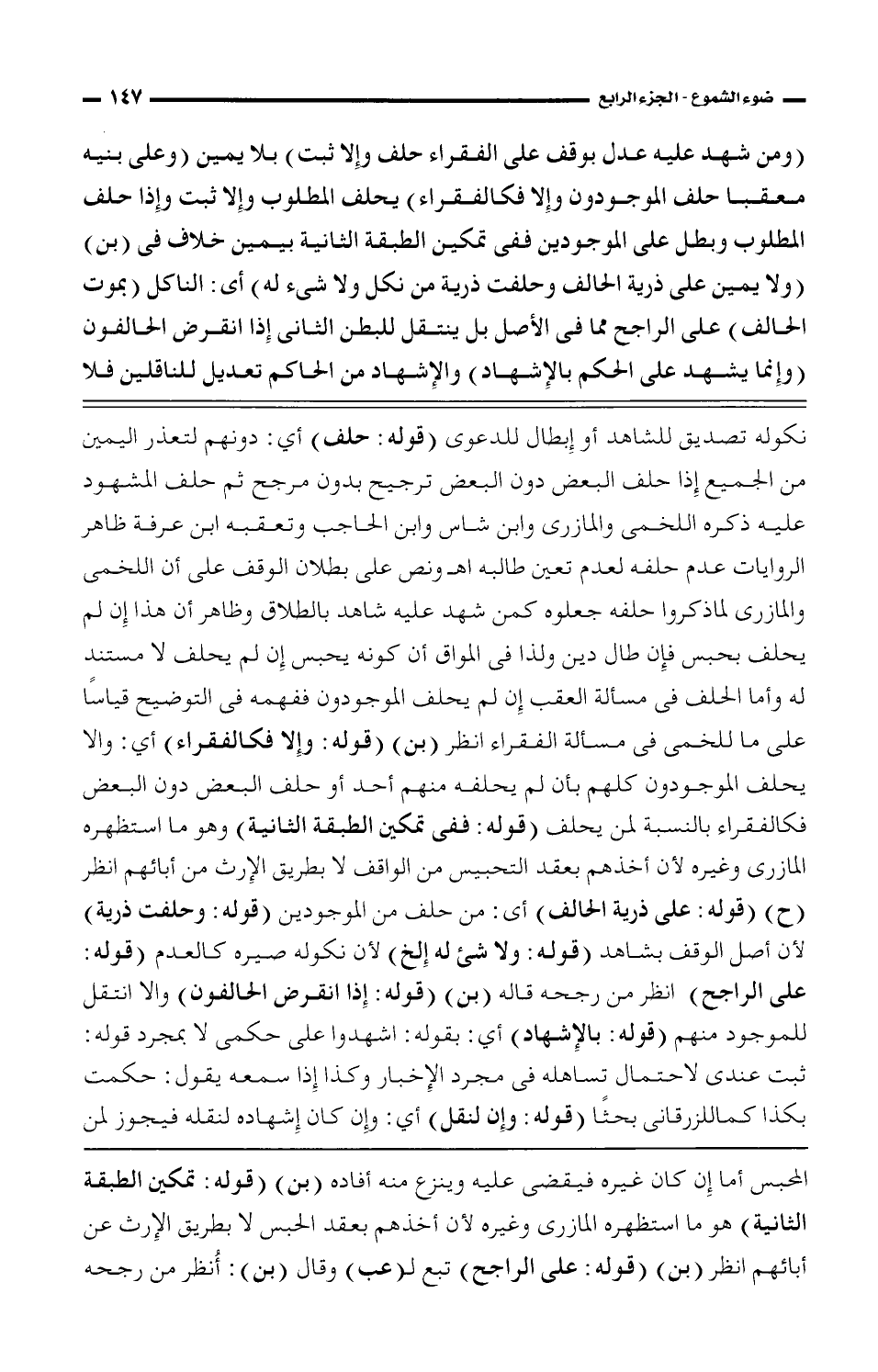 (ومن شهد عليه عدل بوقف على الفقراء حلف وإلا ثبت) بلا يمين (وعلى بنيه معقبا حلف الموجودون وإلا فكالفقراء) يحلف المطلوب وإلا ثبت وإذا حلف المطلوب وبطل على الموجودين ففي تمكين الطبقة الثانية بيمين خلاف في (بن) (ولا يمين على ذرية الحالف وحلفت ذرية من نكل ولا شيء له) أي: الناكل (بموت الحالف) على الراجح مما في الأصل بل ينتقل للبطن إذا انقرض الحالفون (وإنما يشهد على الحكم بالإشهاد) والإشهاد من الحاكم تعديل للناقلين فلا