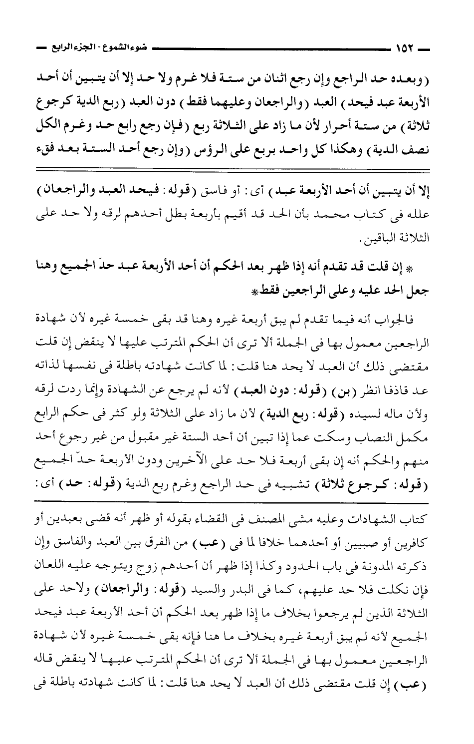 * إن قلت قد تقدم أنه إذا ظهر بعد الحكم أن أحد الأربعة عبد حد الجميع وهنا جعل الحد عليه وعلى الراجعين فقط*