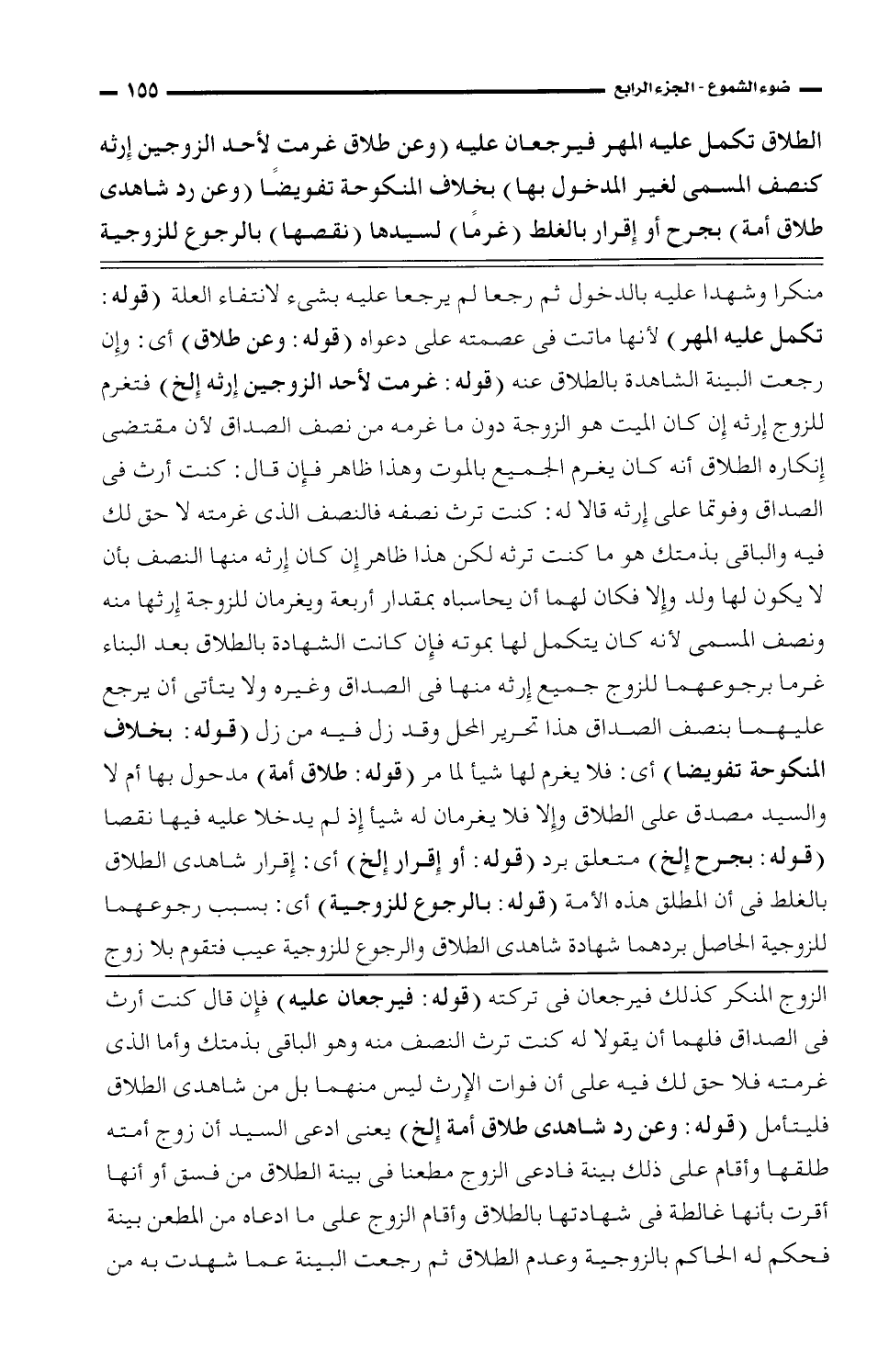 منكرا وشهدا عليه بالدخول ثم رجعا لم يرجعا عليه بشيء لانتفاء العلة (قوله: تكمل عليه المهر) لأنها ماتت في عصمته على دعواه (قوله: وعن طلاق) أي: وإن رجعت البينة الشاهدة بالطلاق عنه (قوله: غرمت لأحد الزوجين إرثه إلخ) فتغرم للزوج إرثه إن كان الميت هو الزوجة دون ما غرمه من نصف الصداق لأن مقتضى إنكاره الطلاق أنه كان يغرم الجميع بالموت وهذا ظاهر فإن قال: كنت أرث في الصداق وفوتما على إرثه قالا له: كنت ترث نصفه فالنصف الذي غرمته لا حق لك فيه والباقي بذمنك هو ما كنت ترثه لكن هذا ظاهر إن كان إرثه منها النصف بأن لا يكون لها ولد وإلا فكان لهما أن يجبساه بمقدار أربعة ويغرمان للزوجة إرثها منه ونصف المسمى لأنه كان يتكمل لها بموته فإن كانت الشهادة بالطلاق بعد البناء غرما برجوعهما للزوج جميع إرثه منها في الصداق وغيره ولا يأتي أن يرجع عليهما بنصف الصداق هذا تحرير المحل وقد زل فيه من زل (قوله: بخلاف المنكوجة تفويضا) أي: فلا يغرم لها شيأ لما مر (قوله: طلاق أمة) مدحول بها أم لا والسيد مصدق على الطلاق وإلا فلا يغرمان له شيأ إذ لم يدخلا عليه فيها نقصا (قوله: بجرح إلخ) متعلق برد (قوله: أو إقرار إلخ) أي: إقرار شاهدى الطلاق بالغلط في أن المطلق هذه الأمة (قوله: بالرجوع للزوجية) أي: بسبب رجوعهما للزوجية الحاصل بردهما شهادة شاهدي الطلاق والرجوع للزوجية عيب فتقوم بلا زوج