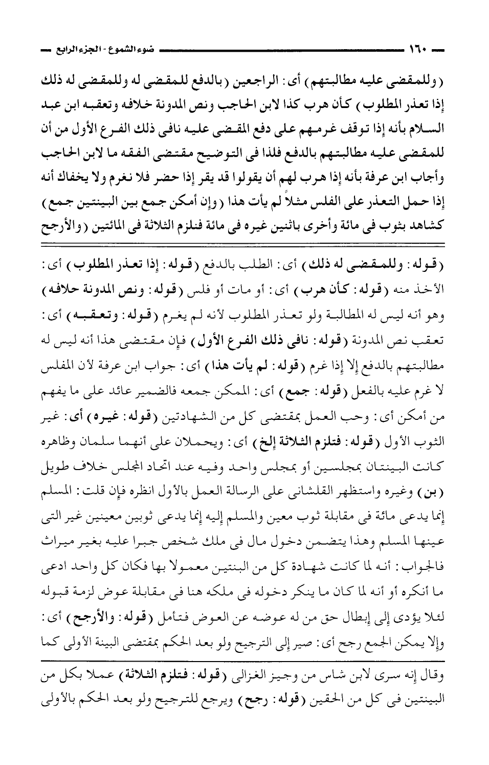 (وللمقضي عليه مطالبتهم) أي: الراجعين (بالدفع للمقضي له وللمقضي له ذلك إذا تعذر المطلوب) كأن هرب كذا لابن الحاجب ونص المدونة خلافه وتعقبه ابن عبد السلام بأنه إذا توقف غرمهم على دفع المقضى عليه نافي ذلك الفرع الأول من أن للمقضي عليه مطالبتهم بالدفع فلذا في التوضيح مقتضى الفقه ما لابن الحاجب وأجاب ابن عرفة إذا هرب لهم أن يقولوا قد يقر إذا حضر فلا نغرم ولا يخفاك أنه إذا حمل التعذر على الفلس مثلا لم يأت هذا (وإن أمكن جمع بين البينتين جمع) كشاهد بثوب في مائة وأخرى باثنين غيره في مائة فنلزم الثلاثة في المائتين (والأرجح
