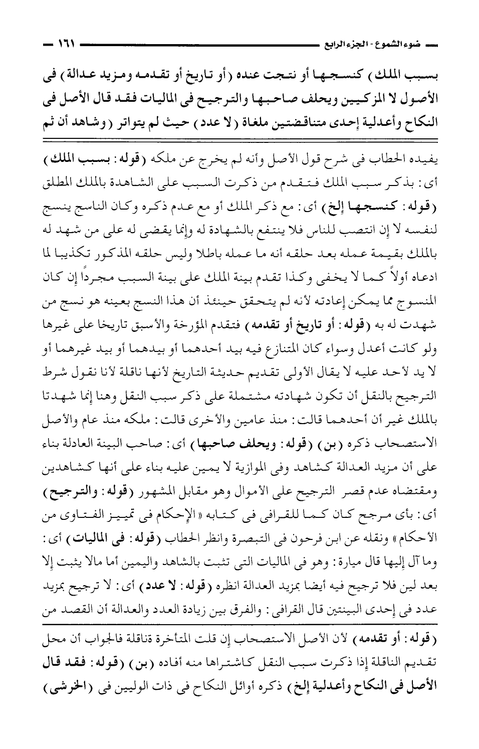 بسبب الملك) كنسجها أو نتجت عنده (أو تاريخ أو تقدمه ومزيد عدالة) في الأصول لا المزكيين ويحلف صاحبها والترجيح في الماليات فقد قال الأصل في النكاج وأعدلية إحدى متناقضتين ملغاة (لا عدد) حيث لم يتواتر (وشاهد أن ثم