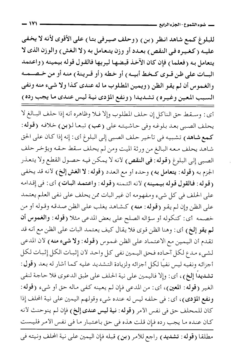 للبلوغ كمع شاهد انظر (بن) (وحلف صيرفى بتا) على الأقوى لأنه لا يخفى عليه (كغيره في النقص) بعدد أو وزن يتعامل به (لا الغش) الوزن الذي لا يتعامل به (فعلما) فإن كان الأخذ قبضها ليريها فالقول قوله بيمينه (واعتمد البات على ظن فقوي كخط أبيه) أو خطه (أو قرينة) منه أو من خصمه والغموس إن لم يقو الظن (ويمين المطلوب ما له عندي كذا ولا شيء منه ونفى السبب المعين وغيره) تشديدا (ونفع المؤدى نية ليس عندي ما يجب (رده)