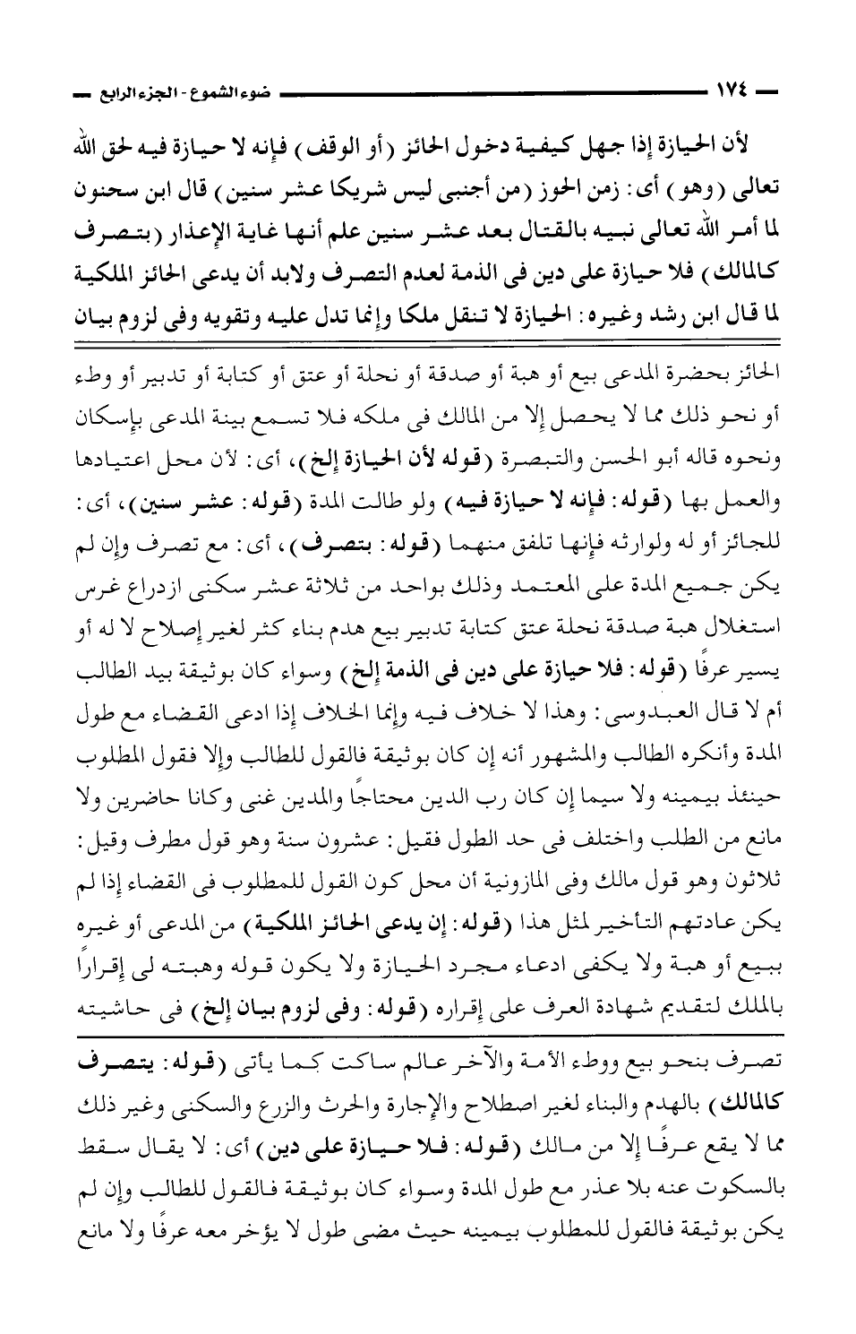الحائز بحضرة المدعى بيع أو هبة أو صدقة أو نحلة أو عتق أو كتابة أو تدبير أو وطء أو نحو ذلك مما لا يحصل إلا من المالك في ملكه فلا تسمع بينة المدعى بإسكان ونحوه قاله أبو الحسن والتبصرة (قوله: لأن الحيازة إلخ)، أي: لأن محل اعتيادها والعمل بها (قوله: فإنه لا حيازة فيه) ولو طالت المدة (قوله: عشر سنين)، أي: للجائز أو له ولوارثه فإنها تلفق منهما (قوله: بتصرف)، أي: مع تصرف وإن لم يكن جميع المد على المعتمد وذلك بواحد من ثلاثة عشر سكنى ازدراع غرس استغلال هبة صدقة نحلة عتق كتابة تدبير بيع هدم بناء كثر لغير إصلاح لا له أو يسير عرفا (قوله: فلا حيازة على دين في الذمة إلخ) وسواء كان بوثيقة بيد الطالب أم لا قال العبدوسي: وهذا لا خلاف فيه وإنما الخلاف إذا ادعى القضاء مع طول المدة وأنكره الطالب والمشهور أنه إذا كان بوثيقة فالقول للطالب وإلا فقول المطلوب حينئذ بيمينه ولا سيما إن كان رب الدين محتاجا والمدين غنى وكانا حاضرين ولا مانع من الطلب واختلف في حد الطول فقيل: عشرون سنة وهو قول مطرف وقيل: ثلاثون وهو قول مالك وفي المازونية أن محل كون القول للمطلوب في القضاء إذا لم يكن عادتهم التأخير لمثل هذا (قوله: إن يدعي الحائز الملكية) من المدعى أو غيره ببيع أو هبة ولا يكفي ادعاء مجرد الحيازة ولا يكون قوله وهبته لي إقرارا بالملك لتقديم شهادة العرف على إقراره (قوله: وفي لزوم بيان إلخ) في حاشيته