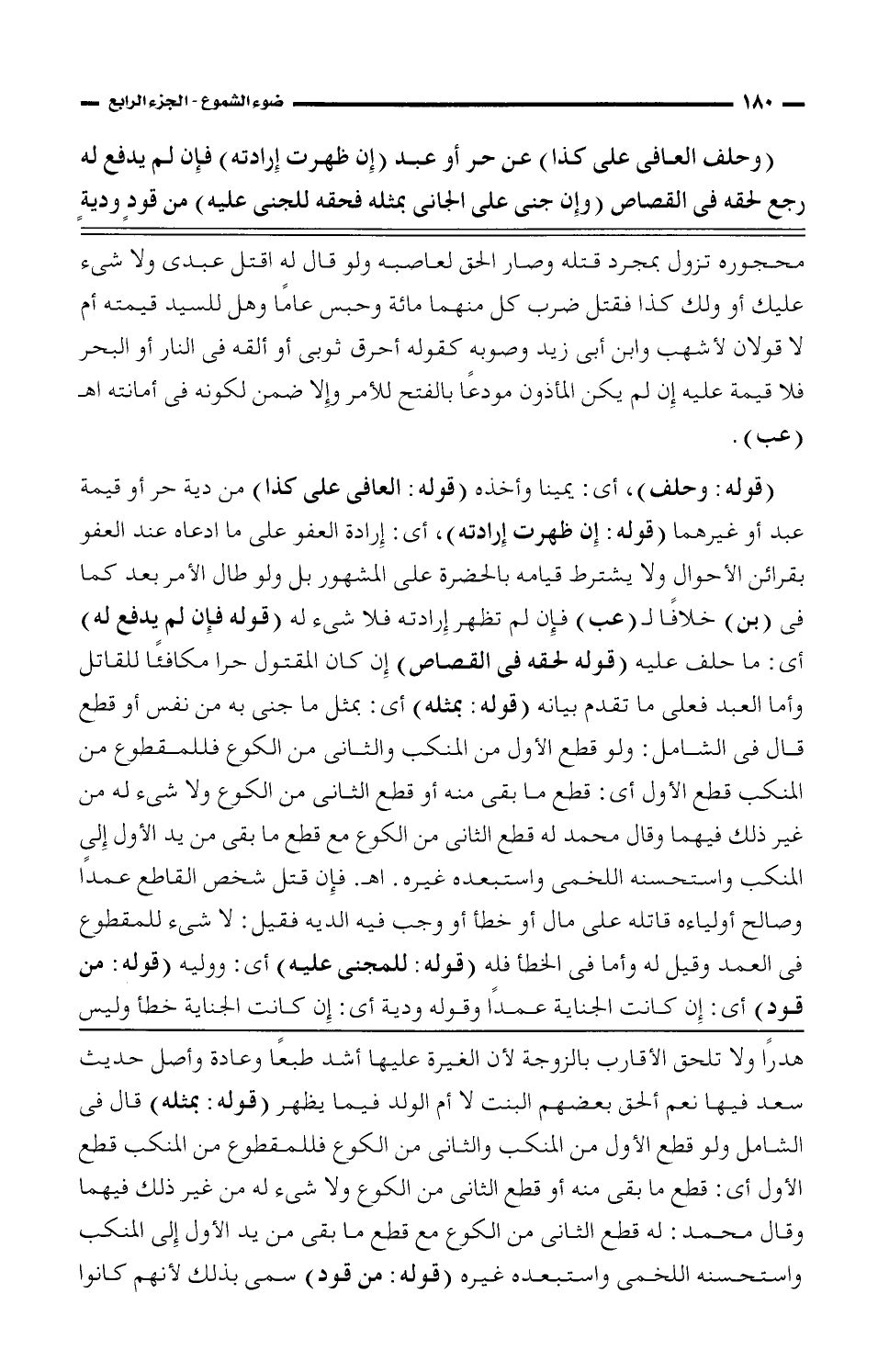 هدرا ولا تلحق الأقارب بالزوجة لأن الغيرة عليها أشد طبعا وعادة وأصل حديث سعد فيها نعم ألحق بعضهم البنت لا أم الولد فيما يظهر (قوله: بمثله) قال في الشامل ولو قطع الأول من المنكب والثاني من الكوع فللمقطوع من المنكب قطع الأول أي: قطع ما بقي منه أو قطع الثاني من الكوع ولا شيء له من غير ذلك فيهما وقال محمد: له قطع الثاني من الكوع مع قطع ما بقي من يد الأول إلى المنكب واستحسنه اللخمي واستبعده غيره (قوله: من قود) سمي بذلك لأنهم كانوا