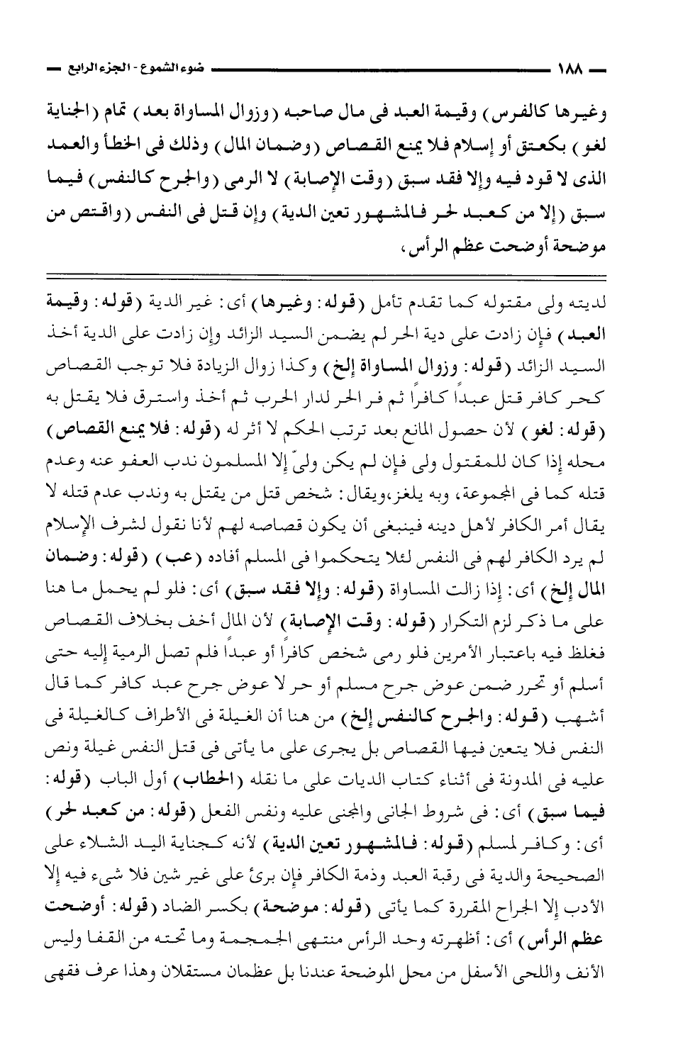 لديته ولى مقتوله كما تقدم تأمل (قوله: وغيرها) أي: غير الدية (قوله: وقيمة العبد) فإن زادت على دية الحر لم يضمن السيد الزائد وإن زادت على الدية أخذ السيد الزائد (قوله: وزال المساواة إلخ) وكذا زوال الزيادة فلا توجب القصاص كحر كافر قتل عبدا كافرا ثم فر الحر لدار الحرب ثم أخذ واسترق فلا يقتل به (قوله: لغو) لأن حصول المانع بعد ترتب الحكم لا أثر له (قوله: فلا يمنع القصاص) محله إذا كان للمقتول ولي فإن لم يكن ولي إلا المسلمون ندب العفو عنه وعدم قتله كما في المجموعة، وبه يلغز، ويقال: شخص قتل من يقتل به وندب عدم قتله لا يقال أمر الكافر لأهل دينه فينبغي أن يكون قصاصه لهم لأنا نقول لشرف الإسلام لم يرد الكافر لهم في النفس لئلا يتحكموا في المسلم أفاده (عب) (قوله: وضمان المال إلخ) أي: إذا زالت المستواة (قوله: وإلا فقد سبق) أي: فلو لم يحمل ما هنا على ما ذكر لزم التكرار (قوله: وقت الأصابة) لأن المال أخف بخلاف القصاص فغلظ فيه باعتبار الأمرين فلو رمى شخص كافرا أو عبدا فلم تصل الرمية إليه حتى أسلم أو تحرر ضمن عوض جرح مسلم أو حر لا عوض جرح عبد كافر كما قال أشهب (قوله: والجرح كالنفس إلخ) من هنا أن الغيلة في الأطراف كالغيلة في النفس فلا يتعين فيها القصاص بل يجرى على ما يأتي في قتل النفس غيلة ونص عليه في المدونة في أثناء كتاب الديات على ما نقله (الحطاب) أول الباب (قوله: فيما سبق) أي: في شروط الجاني والمجني عليه ونفس الفعل (قوله: من كعبد لحر) أي: وكافر لمسلم (قوله: فالمشهور تعين الدية) لأنه كجناية اليد الشلاء على الصحيحة والدية في رقبة وذمة الكافر فإن برئ على غير شين فلا شيء فيه إلا الأدب إلا الجراح المقرره كما يأتي (قوله: موضحة) بكسر الضاد (قوله: أوضحت عظم الرأس) أي: أظهرته وحد الرأس منتهى الجمجمة وما تحته من القفا وليس الأنف واللحى السفل من محل الموضحة عندنا بل عظمان مستقلان وهذا عرف فقهى