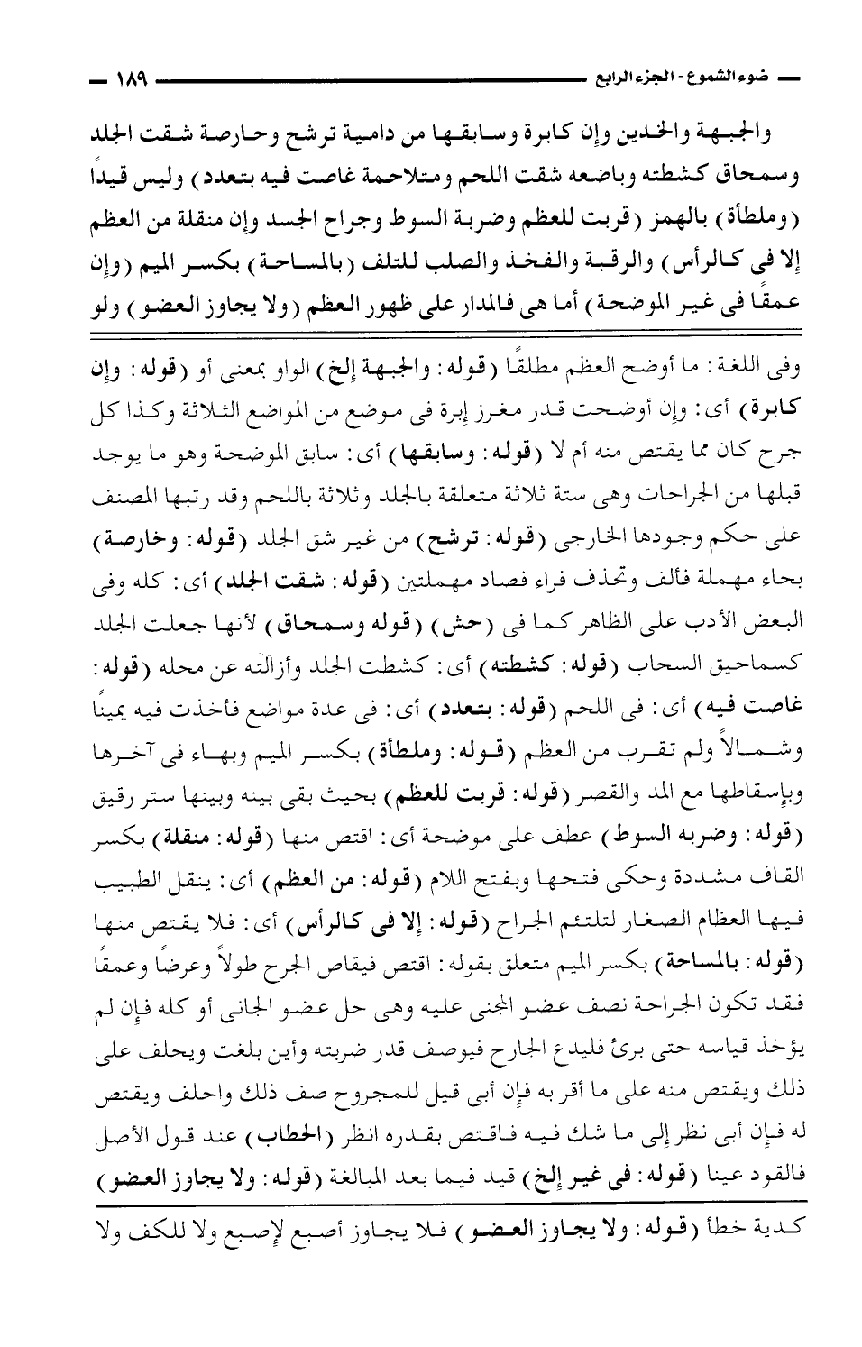 والجبهة الخدين وإن كابرة وسابقها من دامية ترشح وحارصة شقت الجلد وسمحاق كشطته وباضعه شقت اللحم ومتلاحمة غاصت فيه بتعدد) وليس قيدا (وملطأة) بالهمز (قربت للعظم وضربة السوط وجراح الجسد وإن منقلة من العظم إلا في كالرأس) والرقبة والفخذ والصلب للتلف (وبالمساحة) بكسر الميم (وإن عمقا في غير الموضحة) أما هي فالمدار على ظهور العظم (ولا يجاوز العضو) ولو