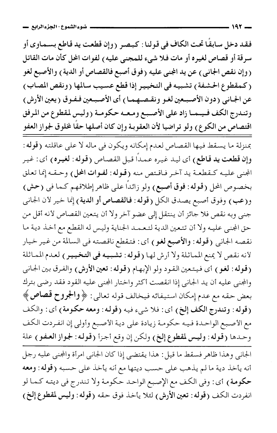 فقد دخل سابقا تحت الكاف في قولنا: كبصر (وإن قطعت يد قاطع بسماوى أو سرقة أو قصاص لغيره أو مات فلا شيء للمجني عليه) لفوات المحل كأن مات القاتل (وإن نقص الجاني) عن يد المجني عليه (فوق أصبع فالقصاص أو الدية) والأصبع لغو (كمقطوع الحشفة) تشبيه في التخيير إذا قطع عسيب سالمها (ونقص المصاب) عن الجاني (دون الأصبعين لغو ونقصهما) أي الأصبعين ففوق (يعين الأرش) وتندرج الكف فيما زاد على الأصبع ومعه حكومة (وليس لمقطوع من المرفق اقتصاص من الكوع) ولو تراضيا لأن العقوبة وإن كان أصلها حقا لمخلوق لجواز العفو