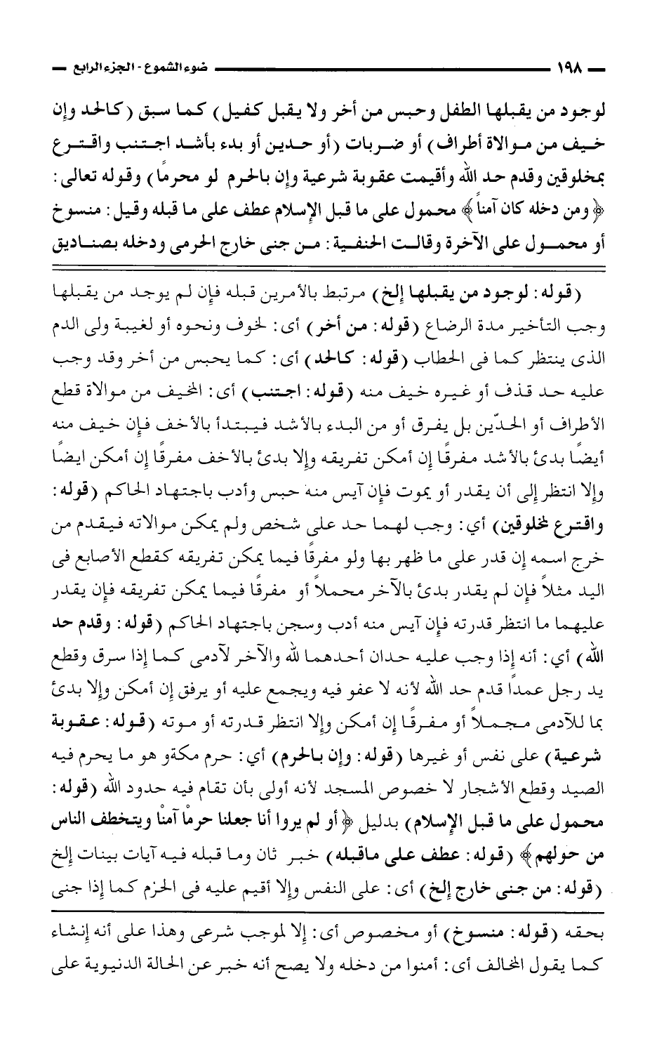 (قوله: لوجود من يقبلها إلخ) مرتبط بالأمرين قبله فإن لم يوجد من يقبلها وجب التأخير مد الرضاع (قوله: من أخر) أي: لخوف ونحوه أو لغيبة ولي الدم الذي ينتظر كما في الحطاب (قوله: كالحد) أي: كما يحبس من أخر وقد وجب عليه حد قذف أو غيره خيف منه (قوله: اجتنب) أي: المخيف من موالاة قطع الأطراف أو الحدين بل يفرق أو من البدء بالأشد فيبتدأ بالأخف فإن خيف منه أيضا بدئ بالأشد مفرقا إن أمكن تفريقه وإلا بدئ بالأخف مفرقا إن أمكن أيضا وإلا انتظر إلى أن يقدر أو يموت فإن آيس منه حبس وأدب باجتهاد الحاكم (قوله: واقترع لمخلوقين) أي: وجب لهما حد على شخص ولم يمكن موالاته فيقدم من خرج اسمه إن قدر على اظهر بها ولو مفرقا فيما يمكن تفريقه كقطع الأصابع في اليد مثلا فإن لم يقدر بدئ بالآخر محملا أو مفرقا فيما يمكن تفريقه فإن يقدر عليهما ما انتظر قدرته فإن آيس منه أدب وسجن باجتهاد الحاكم (قوله: وقدم حد الله) أي: أنه إذا وجب عليه حدان أحدهما لله والآخر لآدمي كما إذا سرق وقطع يد رجل عمدا قدم حد الله لأنه لا عفو فيه ويجمع عليه أو يرفق إن أمكن وإلا بدئ بما للآدمي مجملا أو مفرقا إن أمكن وإلا انتظر قدرته أو موته (قوله: عقوبة شرعية) على نفس أو غيرها (قوله: وإن بالحرم) أي: حرم مكة وهو ما يحرم فيه الصيد وقطع الأشجار لا خصوص المسجد لأنه أولى بأن تقام فيه حدود الله (قوله: محمول على ما قبل الإسلام) بدليل {أو لم يروا أنا جعلنا حرما آمنا ويتخطف الناس من حولهم} (قوله: عطف على ما قبله) خبر ثان وما قبله فيه آيات بينات إلخ (قوله: من جنى خارج إلخ) أي: على النفس وإلا أقيم عليه في الحرم كما إذا جنى