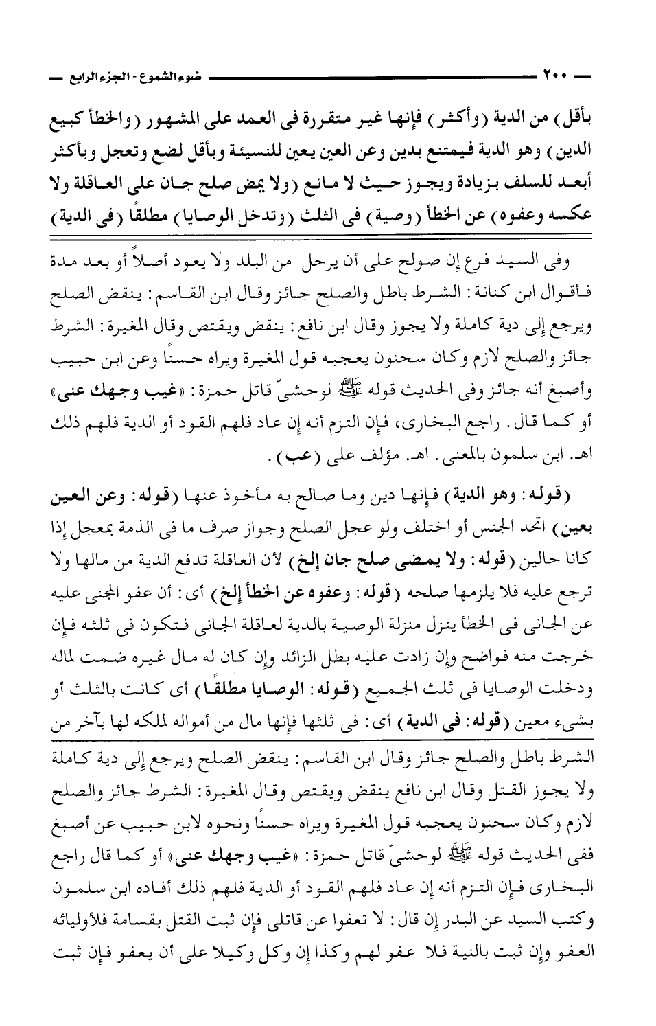 الشرط باطل والصلح جائز وقال اب القاسم: ينقض الصلح ويرجع إلى دية كاملة ولا يجوز القتل وقال ابن نانفع ينقض ويقتص وقال المغيرة: الشرط جائز والصلح لازم وكان سحنون يعجبه قول المغيرة ويراه حسنا ونحوه لابن حبيب عن أصبغ ففي الحديث قوله صلى الله عليه وسلم لو حشى قاتل حمزة: "غيب وجهك عني" أو كما قال راجع البخاري فإن التزم أنه إن عاد فلهم القود أو الدية فلهم ذلك أفاده ابن سلمون وكتب السيد عن البدر إن قال: لا تعفوا عن قاتلي فإن ثبت القتل بقسامة فلأوليائه العفو وإن ثبت بالنية فلا عفو لهم وكذا إن وكل وكيلا على أن يعفو فإن ثبت