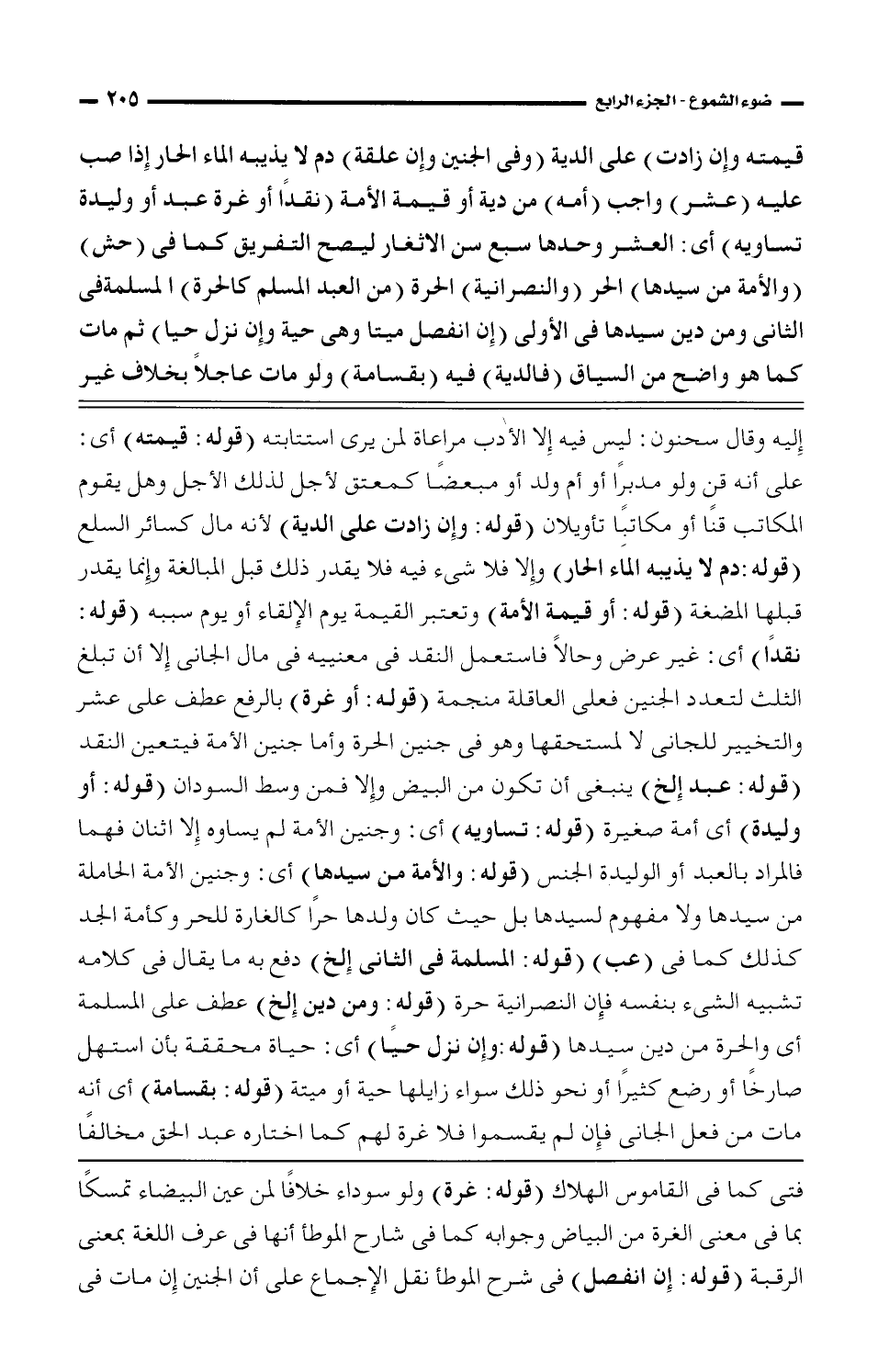 إليه وقال سحنون: ليس فيه إلا الأدب مراعاة لمن يرى استتابته (قوله: قيمته) أي: على أنه قن ولو مدبرا أم ولد أو مبعضا كمعتق لأجل لذلك الأجل وهل يقوم المكاتب قنا أو مكاتبا تأويلان (قوله: وإن زادت على الدية) لأنه مال كسائر السلع (قوله: دم لا يذيبه الماء الحار) وإلا فلا شيء فيه فلا يقدر ذلك قبل المبالغة وإنما يقدر قبلها المضغة (قوله: أو قيمة الأمة) وتعتبر القيمة يوم الإلقاء أو يوم سببه (قوله: نقدا) أي: غير عرض وحالا فاستعمل النقد في معنييه في مال الجاني إلا أن تبلغ الثلث لتعدد الجنين فعلى العاقلة منجمة (قوله: أو غرة) بالرفع عطف على عشر والتخيير للجاني لا لمستحقها وهو في جنين الحرة وأما جنين الأمة فيتعين النقد (قوله: عبد إلخ) ينبغي أن تكون من البيض وغلا فن السودان (قوله: أو وليدة) أي أمة صغيرة (قوله: تساويه) أي: وجنين الأمة لم يساوه إلا اثنان فهما فالمراد بالعبد أو الوليدة الجنس (قوله: والأمة من سيدها) أي: وجنين الأمة الحاملة من سيدها ولا مفهوم لسيدها بل حيث كان ولدها حرا كالغارة للحر وكأمة الجد كذلك كما في (عب) (قوله: المسلمة في الثاني إلخ) دفع به ما يقال في كلامه تشبيه الشيء بنفسه فإن النصرانية حرة (قوله: ومن دين إلخ) عطف على المسلمة أي والحرة من دين سيدها (قوله: وإن نزل حيا) أي: حياة محققة بأن استهل صارخا أو رضع كثيرا أو نحو ذلك سواء زايلها حية أو ميتة (قوله: بقسامة) أي أنه مات من فعل الجاني فإن لم يقسموا فلا غرة لهم كما اختاره عبد الحق مخالفا