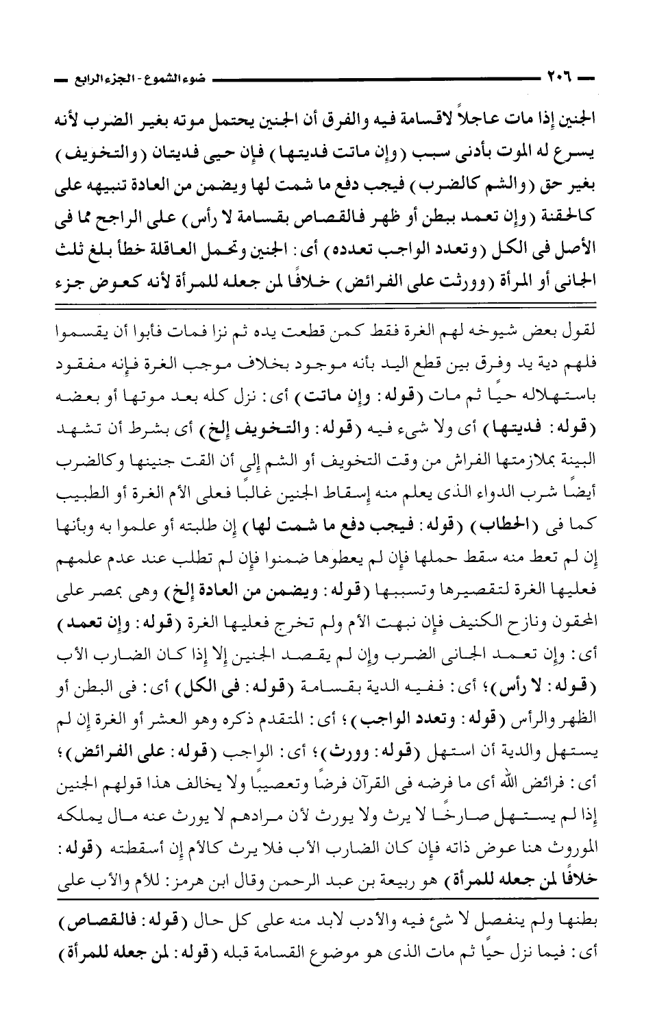 الجنين إذا مات عاجلا لاقسامة فيه والفرق أن الجنين يحتمل موته بغير الضرب لأنه يسرع له الموت بأدنى سبب (وإن ماتت فديتها) فإن حيى فديتان (والتخويف) بغير حق (والشم كالضرب) فيجب دفع ما شمت لها ويضمن من العادة تنبيهه على كالحقنة (وإن تعمد ببطن أو ظهر فالقصاص بقسامة لا رأس) على التراجح مما في الأصل في الكل (وتعدد الواجب تعدده) أي: الجنين وتحمل العاقلة خطأ بلغ ثلث الجاني أو المرأة (وورثت على الفرائض) خلافا لمن جعله للمرأة لأنه كعوض جزء