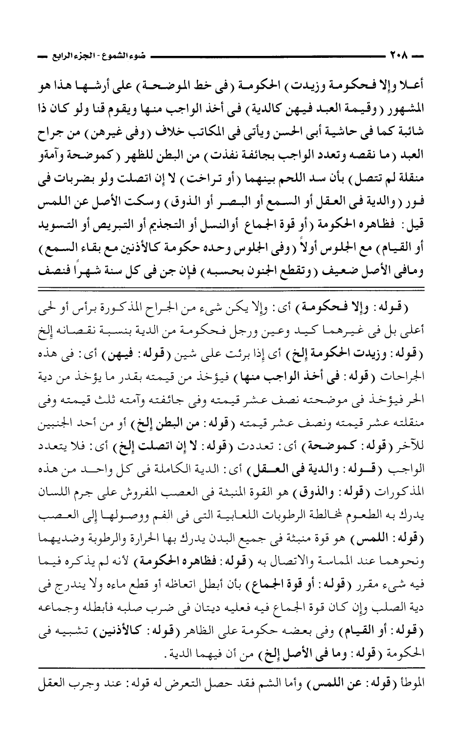 أعلا وإلا فحكومة وزيدت) الحكومة (في خط الموضحة) على أرشها هذا هو المشهور (وقيمة العبد فيهن كالدية) في أخذ الواجب منها ويقوم قنا ولو كان ذا شائبة كما في حاشية أبي الحسن ويأتي في المكاتب خلاف (وفي غيرهن) من جراح العبد (ما نقصه وتعدد الواجب بجائفة نفذت) من البطن للظهر (كموضحة وآمة ومنقلة لم تتصل) بأن سد اللحم بينهما (أو تراخت) لا إن اتصلت ولو بضربات في فور (والدية في العقل أو السمع أو البصر أو الذوق) وسكت الأصل عن اللمس قيل: فظاهره الحكومة (أو قوة الجماع أو النسل أو التجذيم أو التبريص أو التسويد أو القيام) مع الجلوس أولا (وفي الجلوس وحده حكومة كالأذنين مع بقاء السمع) وما في الأصل ضعيف (وتقطع الجنون بحبسه) فإن جن في كل سنة شهرا فنصف