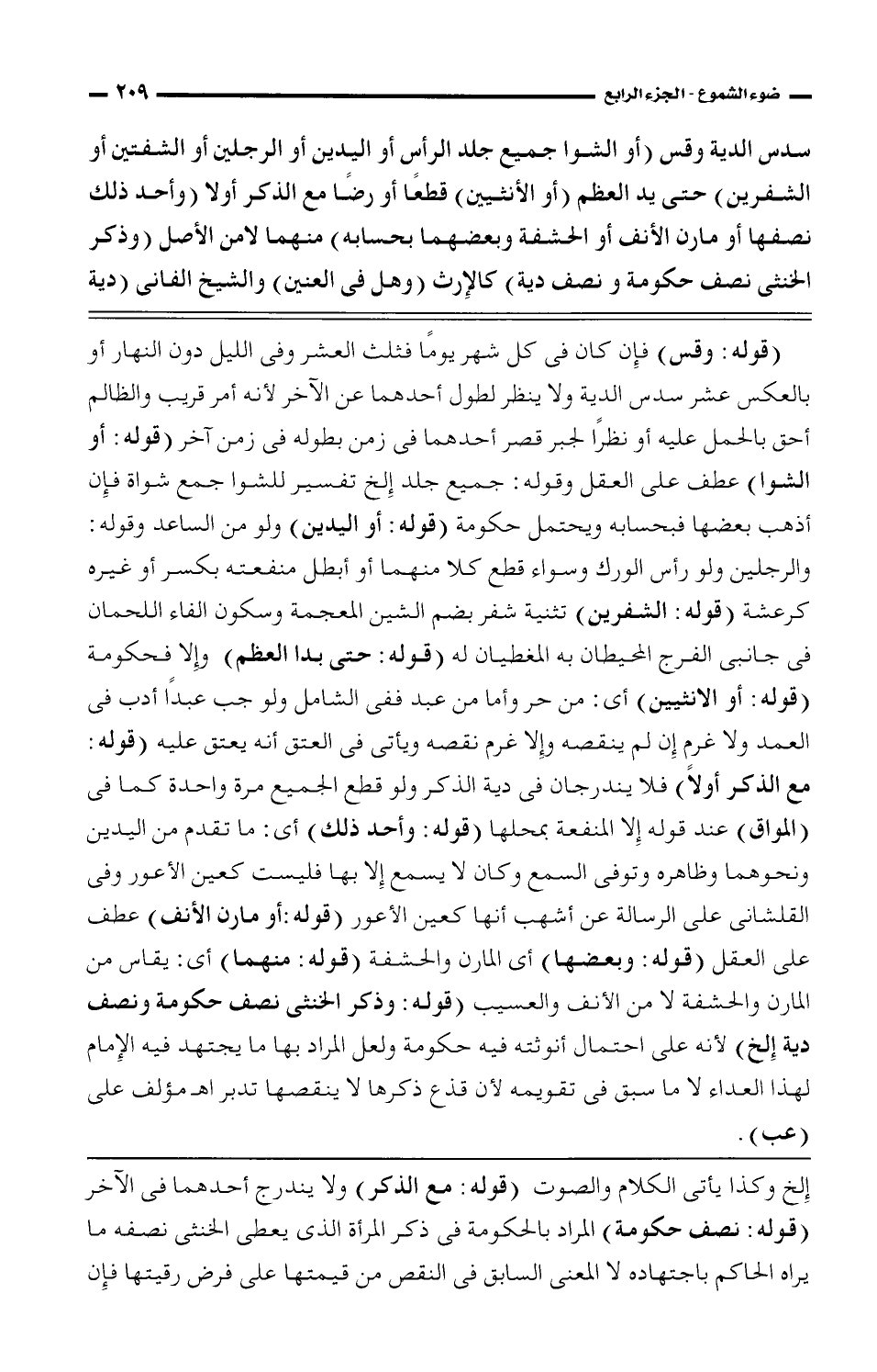 (قوله: وقس) فإن كان في كل شهر يوما فثلث العشر وفي الليل دون النهار أو بالعكس عشر سدس الدية ولا ينظر لطول أحدهما عن الآخر لأنه أمر قريب والظالم أحق بالحمل عليه أو نظرا لجبر قصر أحدهما في زمن بطوله في زمن آخر (قوله: أو الشوا) عطف على العقل وقوله: جميع جلد إلخ تفسير للشوا جمع شواة فإن أذهب بعضها فبحسابه ويحتمل حكومة (قوله: أو اليدين) ولو من الساعد وقوله: الرجلين ولو رأس الورك وسواء قطع كلا منهما أو أبطل منفعته بكسر أو غيره كرعشة (قوله: الشفرين) تثنية شفر بضم الشين المعجمة وسكون الفاء اللحمان في جانبي الفرج المحيطان به المغطيان له (قوله: حتى بدا العظم) وإلا فحكومة (قوله: أو الانثيين) أي: من حر وأما من عبد ففي الشامل ولوجب عبدا أدب في العمد ولا غرم إن لم ينقصه وإلا غرم نقصه ويأتي في العتق أنه يعتق عليه (قوله: مع الذكر أولا) فلا يندرجان في دية الذكر ولو قطع الجميع مرة واحدة كما في (المواق) عند قوله إلا المنفعة بمحلها (قوله: وأحد ذلك) أي: ما تقدم من اليدين ونحوهما وظاهره وتوفى السمع وكان لا يسمع إلا بها فليست كعين الأعور وفي القلشاني على الرسالة عن أشهب أنها كعين الأعور (قوله: أو مارن الأنف) عطف على العقل (قوله: وبعضها) أي المارن والحشفة (قوله: منهما) أي: يقاس من المارن والحشفة لا من الأنف والعسيب (قوله: وذكر الخنثى نصف حكومة ونصف دية إلخ) لأنه على احتمال أنوثته فيه حكومة ولعل المراد بها ما يجتهد فيه الإمام لهذا العداء لا ما سبق في تقويمه لأن قذع ذكرها لا ينقصها تدبر اه مؤلف على (عب).