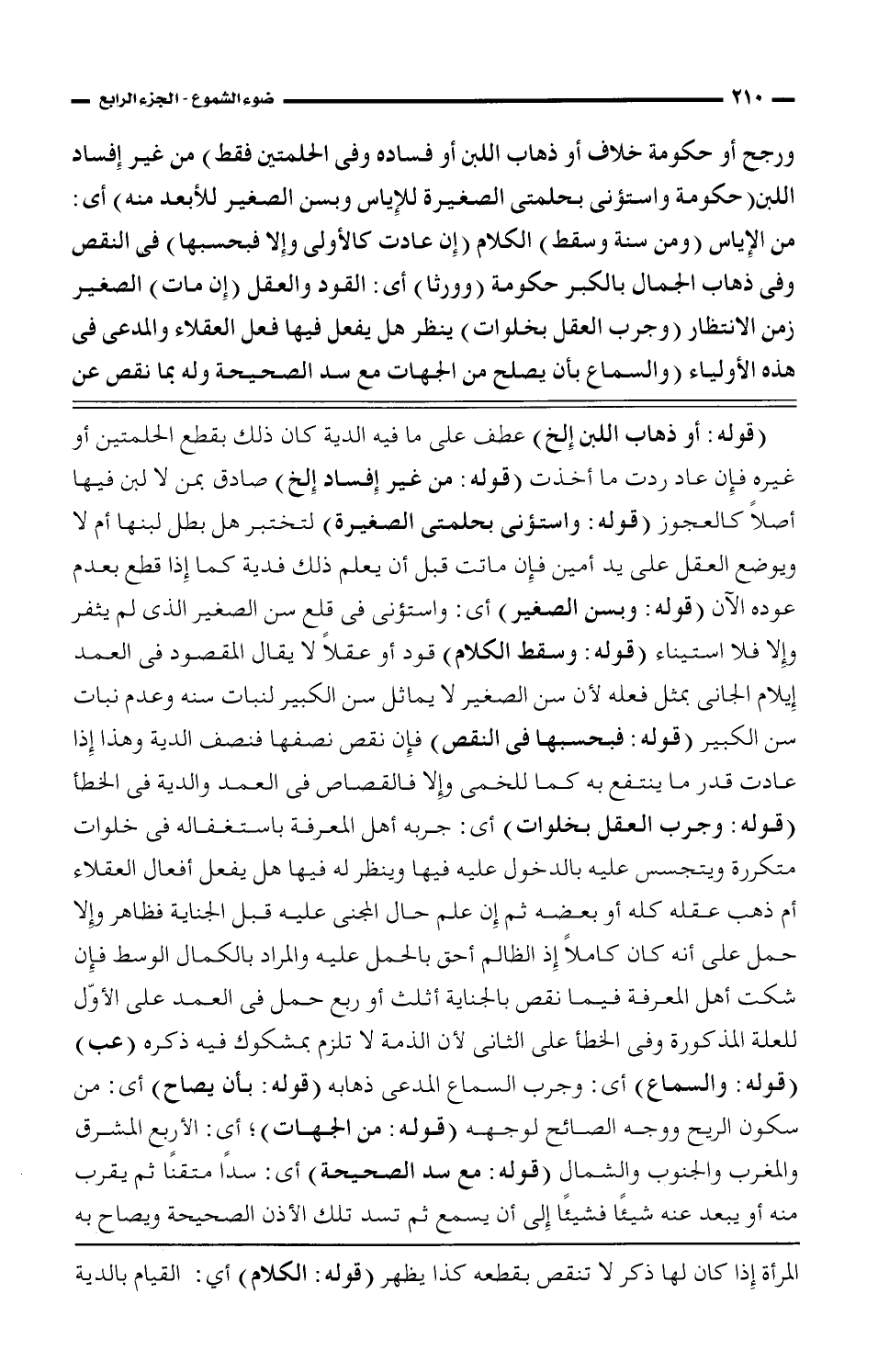 ورجح أو حكومة خلاف أو ذهاب اللبن أو فساده وفي الحلمتين فقط) من غير إفساد اللبن (حكومة واستؤنى بحلمتى الصغيرة للإياس وبسن الصغير للأبعد منه) أي: من الإياس (ومن سنة وسقط) الكلام (إن عادت كالأولى وإلا فبحسبها) في النقص وفي ذهاب الجمال بالكبر حكومة (وورثا) أي: القود والعقل (إن مات) الصغير زمن الانتظار (وجرب العقل بخلوات) ينظر هل يفعل فيها فعل العقلاء والمدعى في هذه الأولياء (والسماع بأن يصلح من الجهات مع سد الصحيحة وله بما نقص عن